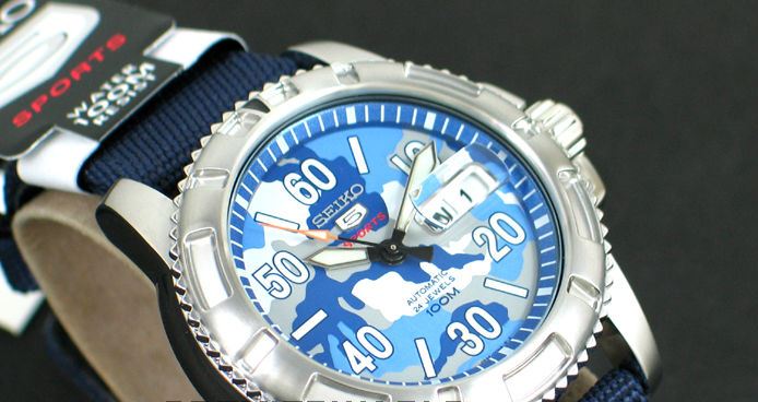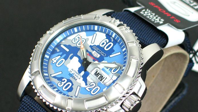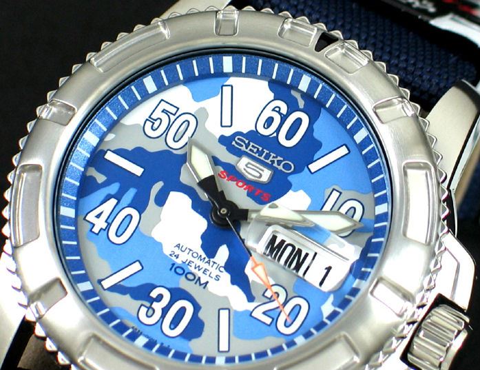 100% AUTHENTIC AND BRAND NEW SEIKO MEN WATCH, JAPAN 4R36 MOVEMENT, AUTOMATIC/HAND WINDING, SECOND HAND HALT MECHANISM, 24 JEWELS, 100M WR, DAY-DATE CALENDAR, MAGNIFIED DATE WINDOW, UNI-DIRECTIONAL ROTATING BEZEL, BLUE CAMOUFLAGE DIAL, SEIKO BLUE TOUGH BAND, HARDLEX CRYSTAL, SEE THRU BASE, STRONG LUMIBRITE HANDS AND MARKERS, CASE WITHOUT CROWN 42.5MM, CASE WITH CROWN 46.5MM, THICKNESS 13MM.