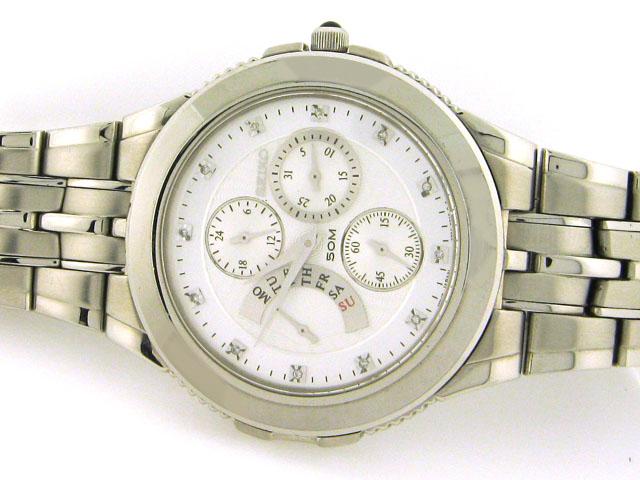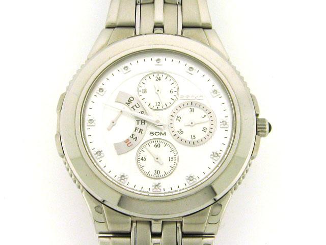 This is a Seiko Men's SRL001 Le Grand Sport Retrograde Day Indicator Watch with the following features: twelve diamonds; second hand subdial; 31 day calendar display; 24 hour display; cabochon crown; sapphire crystal; and water resistant.