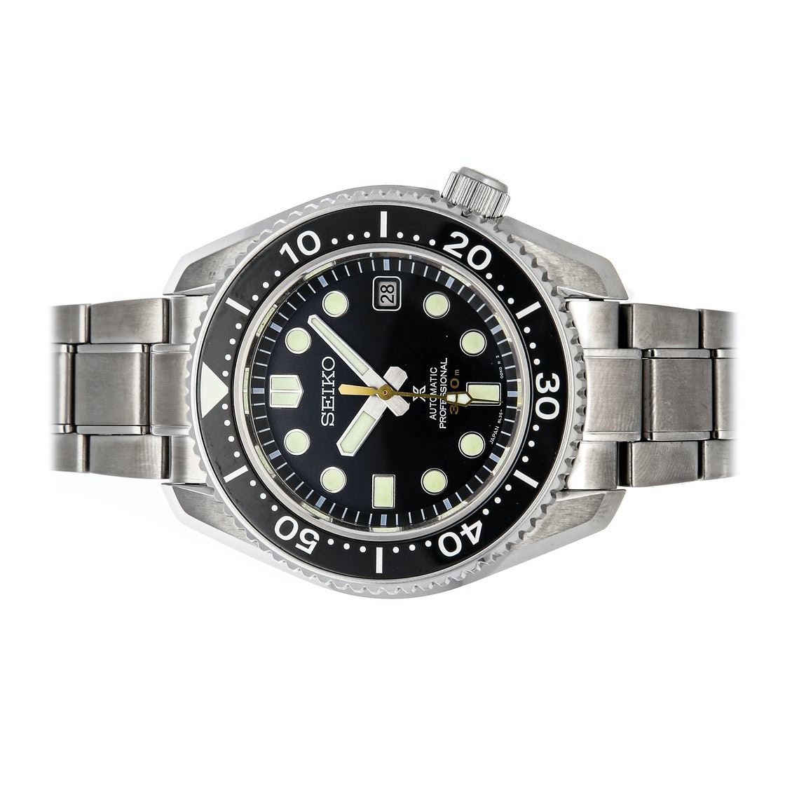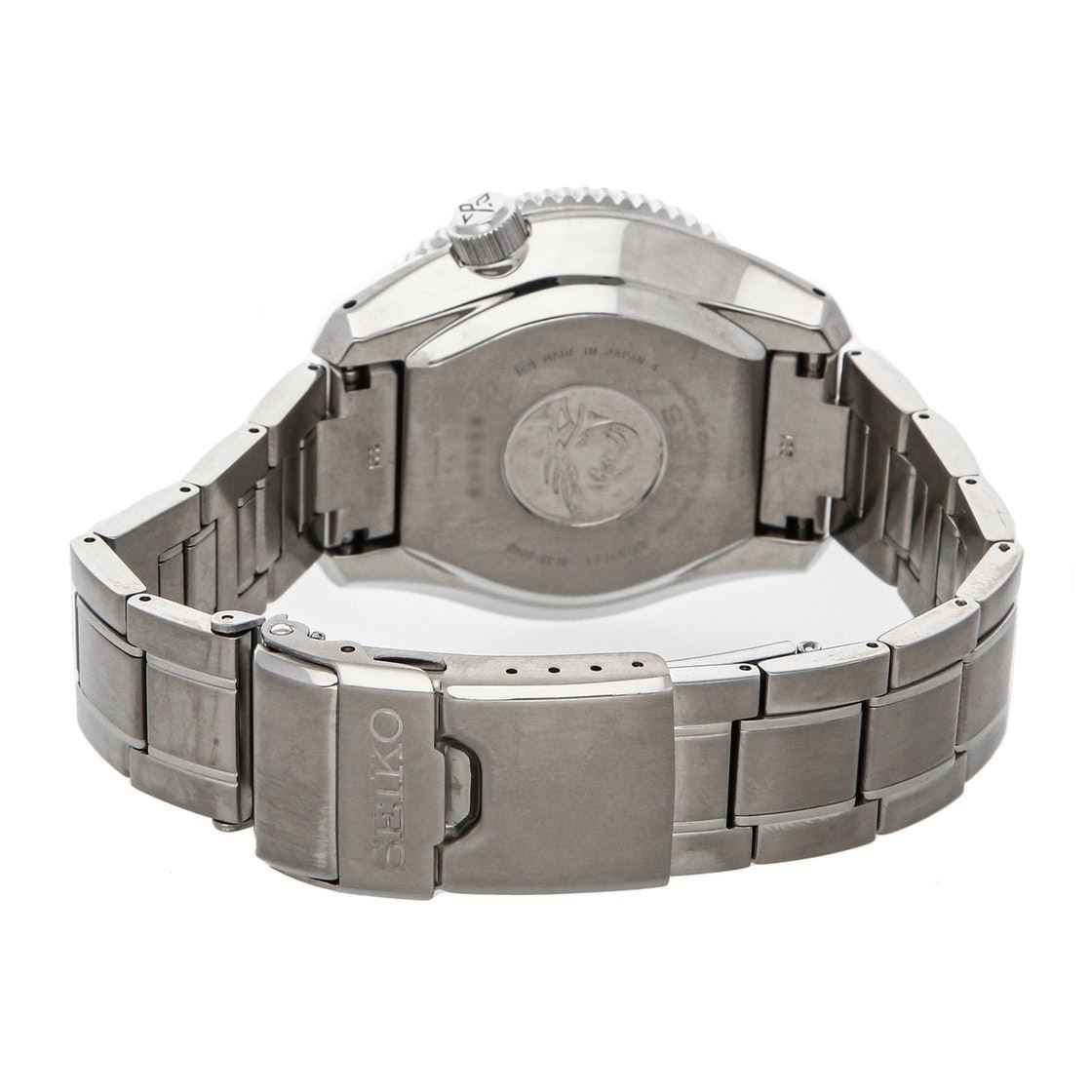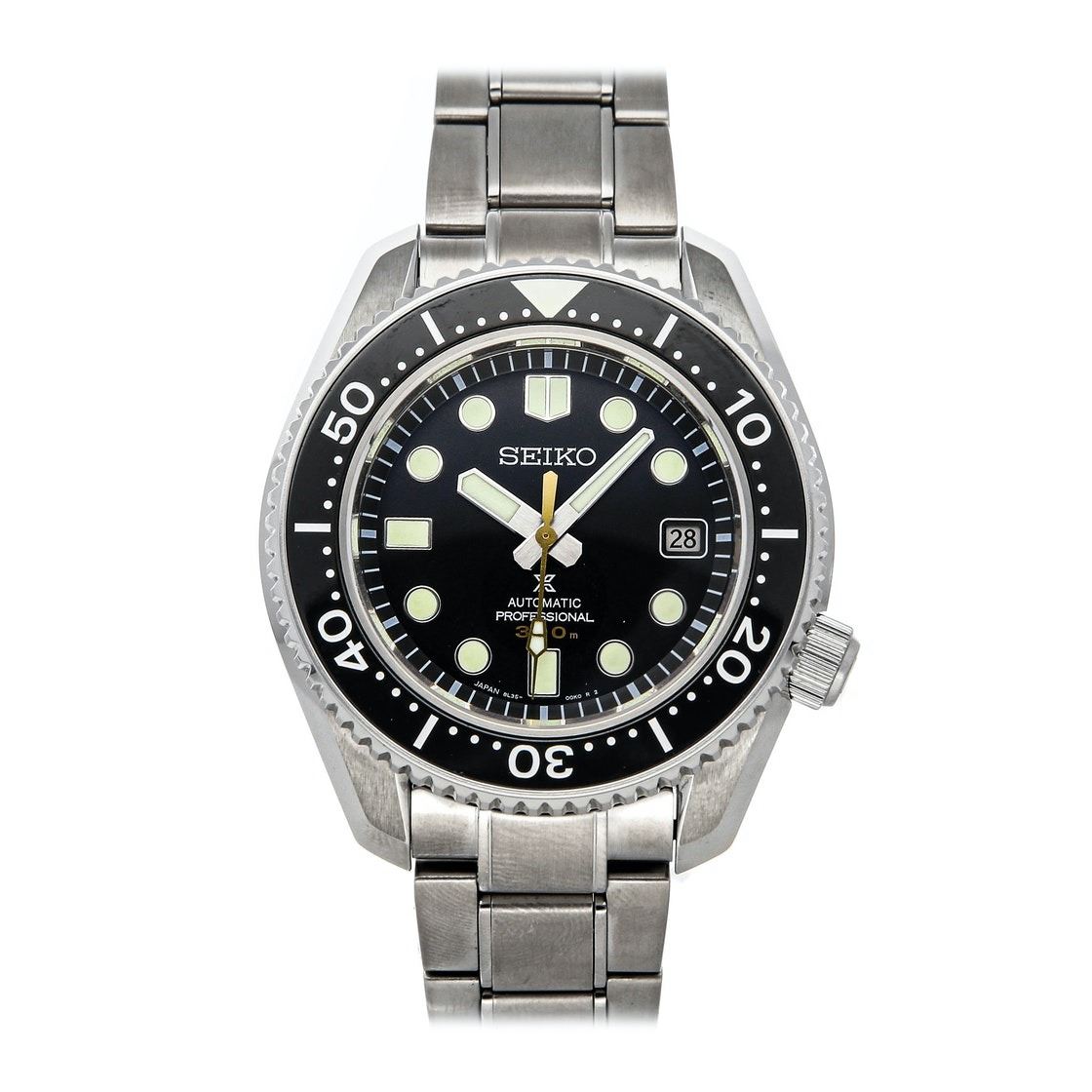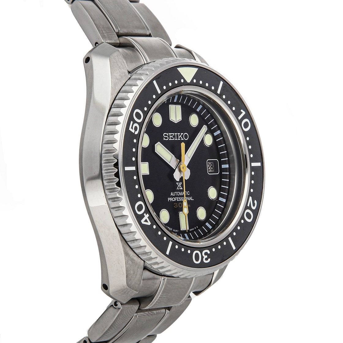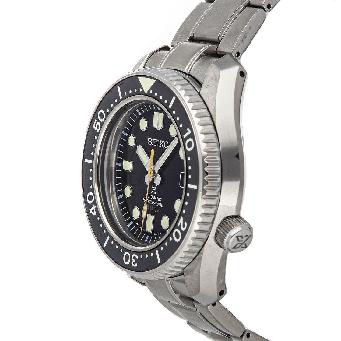Pre-Owned Seiko Prospex Diver (SLA021) self-winding automatic watch, features a 44.3mm stainless steel case with a black ceramic bezel surrounding a black dial on a stainless steel bracelet with folding buckle.
