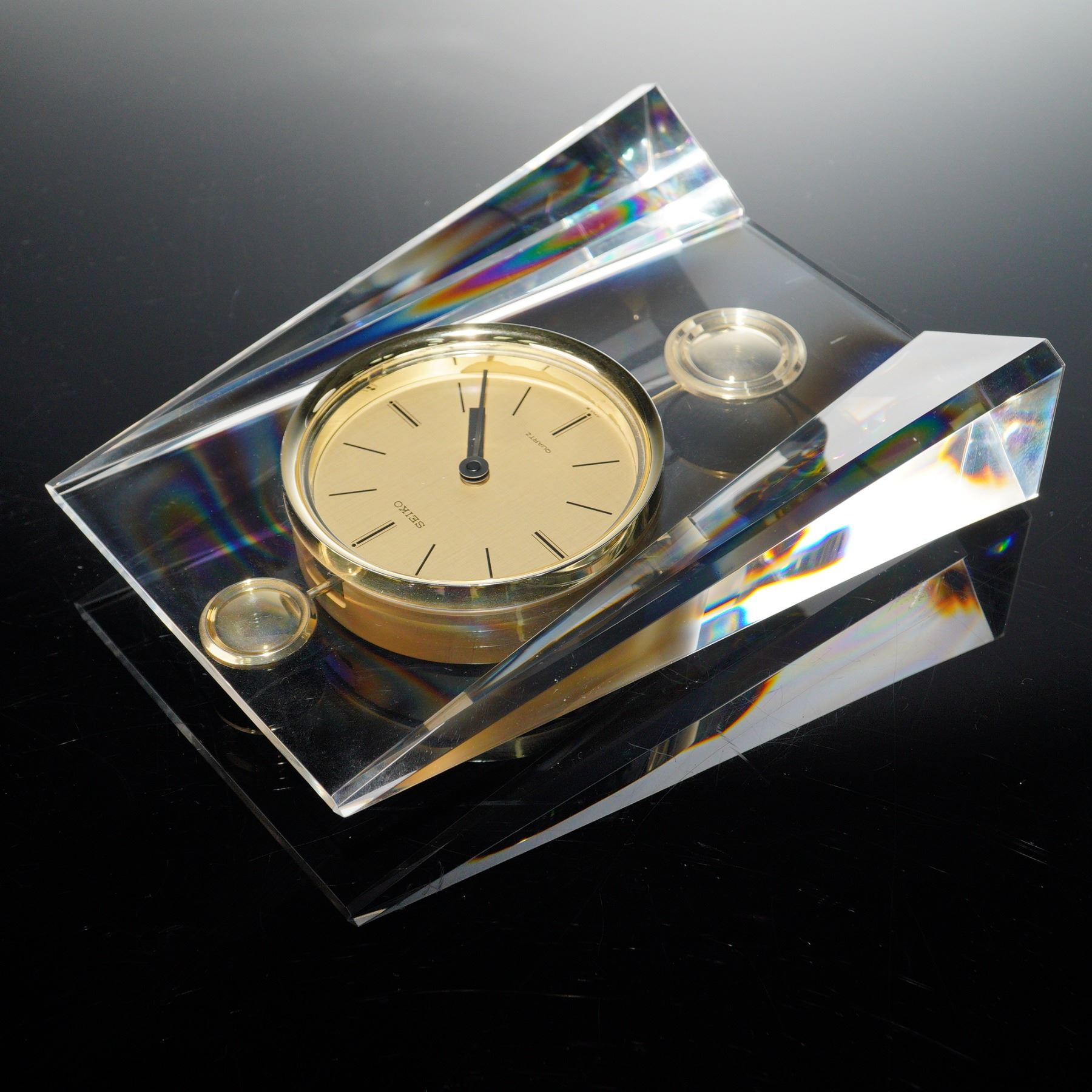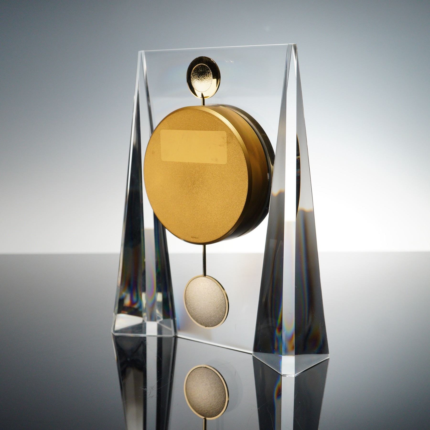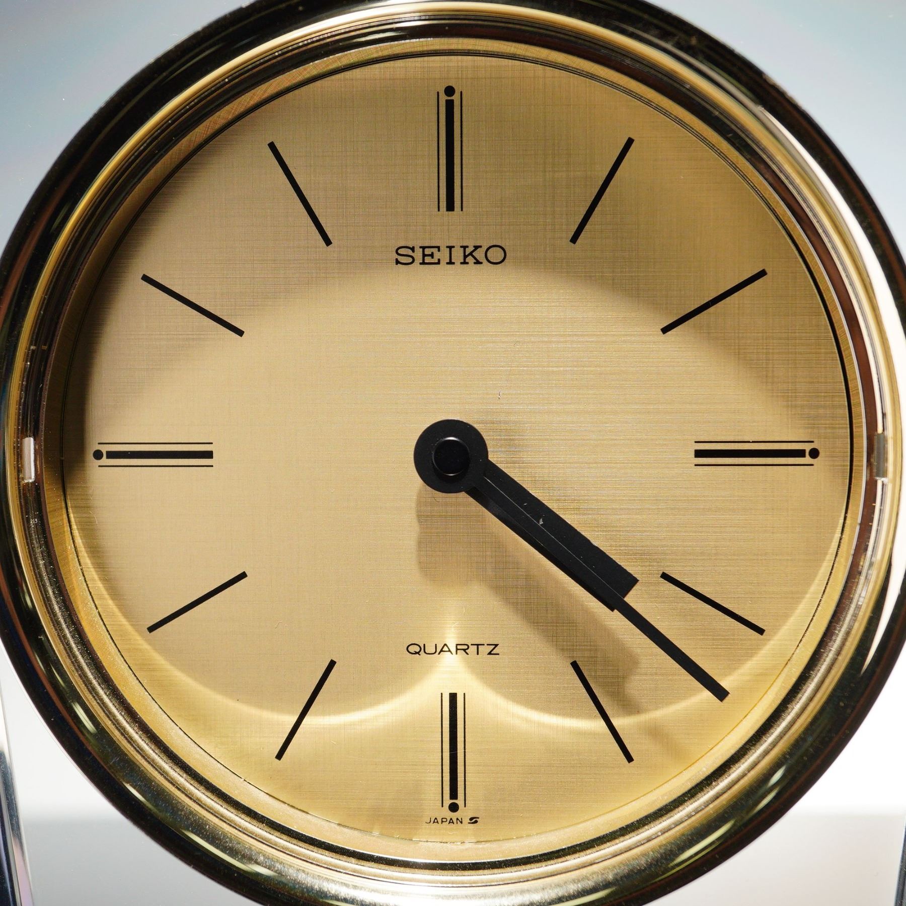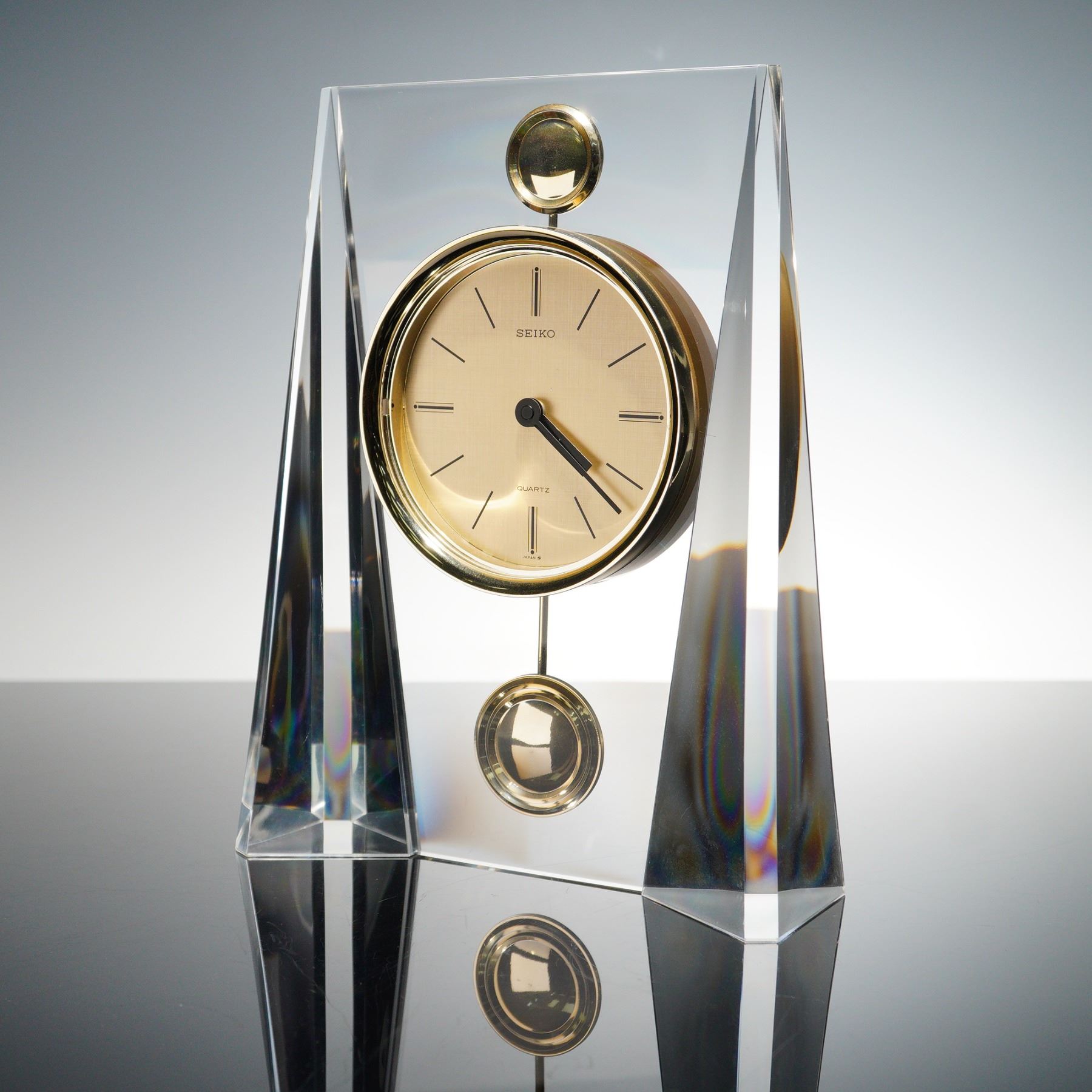 Elegant Seiko quartz pendulum clock encased in a sculptural solid Lucite (acrylic crystal) body. The minimalist design features a circular brushed gold-tone dial with black markers and hands, suspended above a matching pendulum. The triangular crystal form refracts light beautifully, giving the clock a modern, floating appearance from all angles. Marked Seiko Quartz Japan on the dial.
