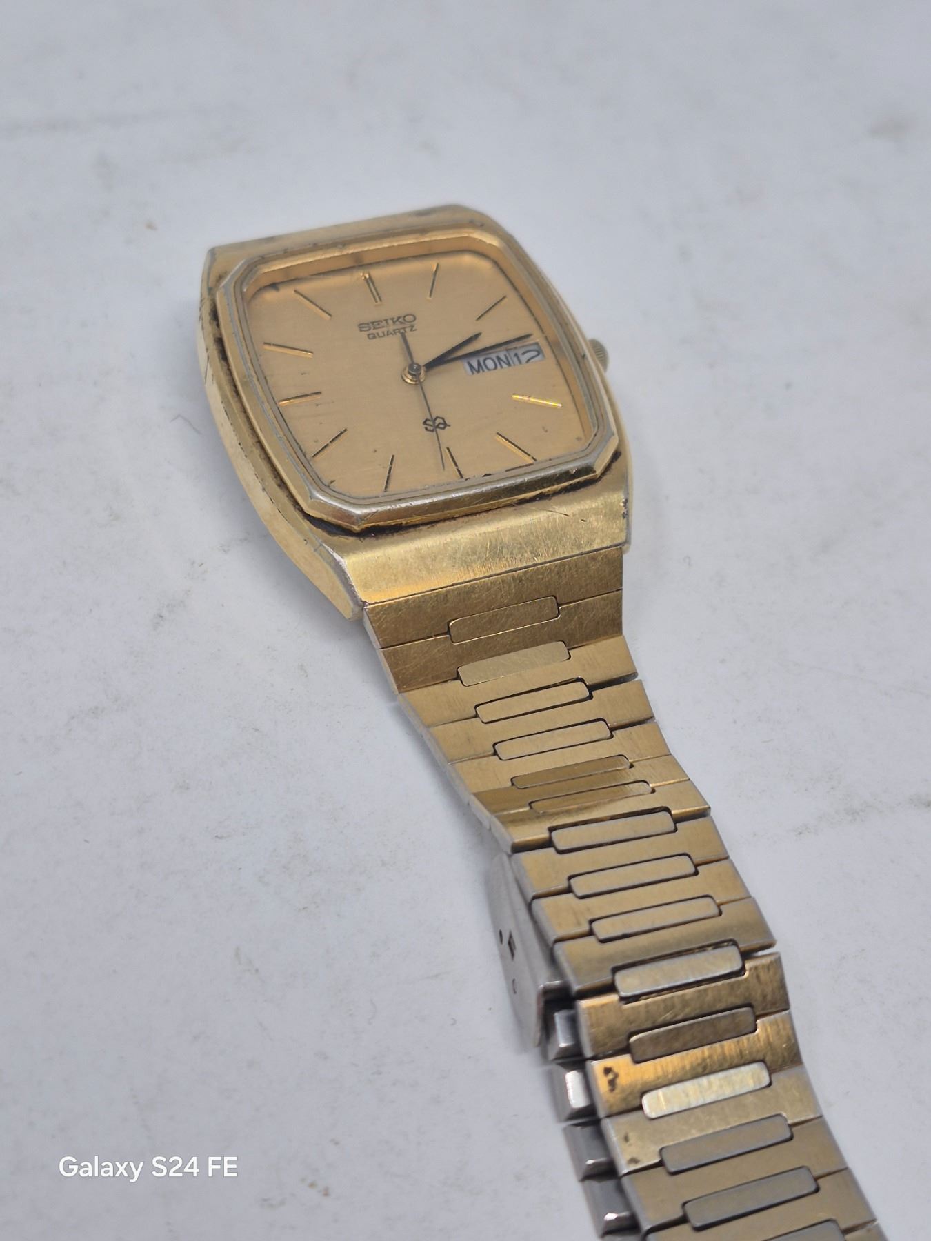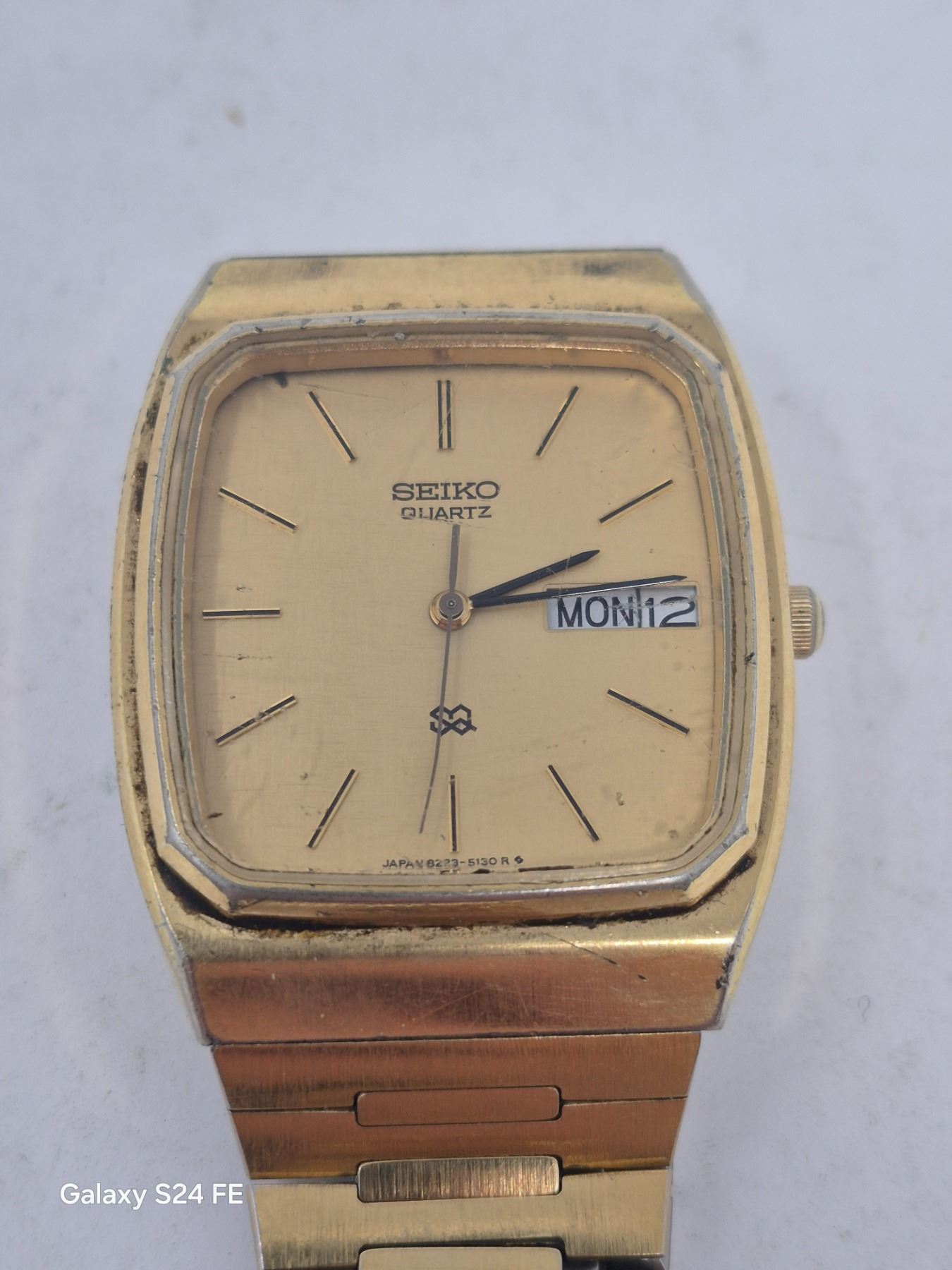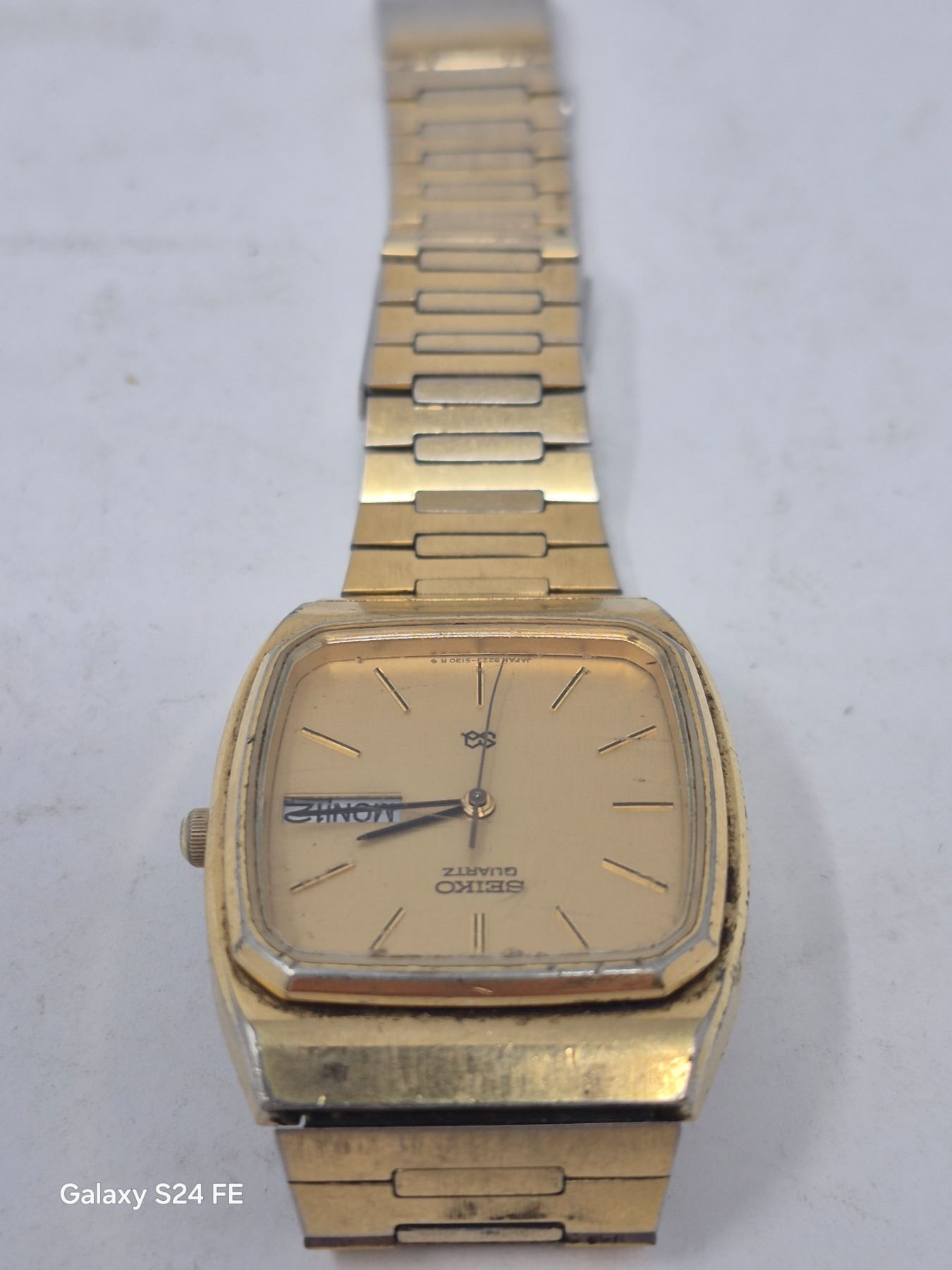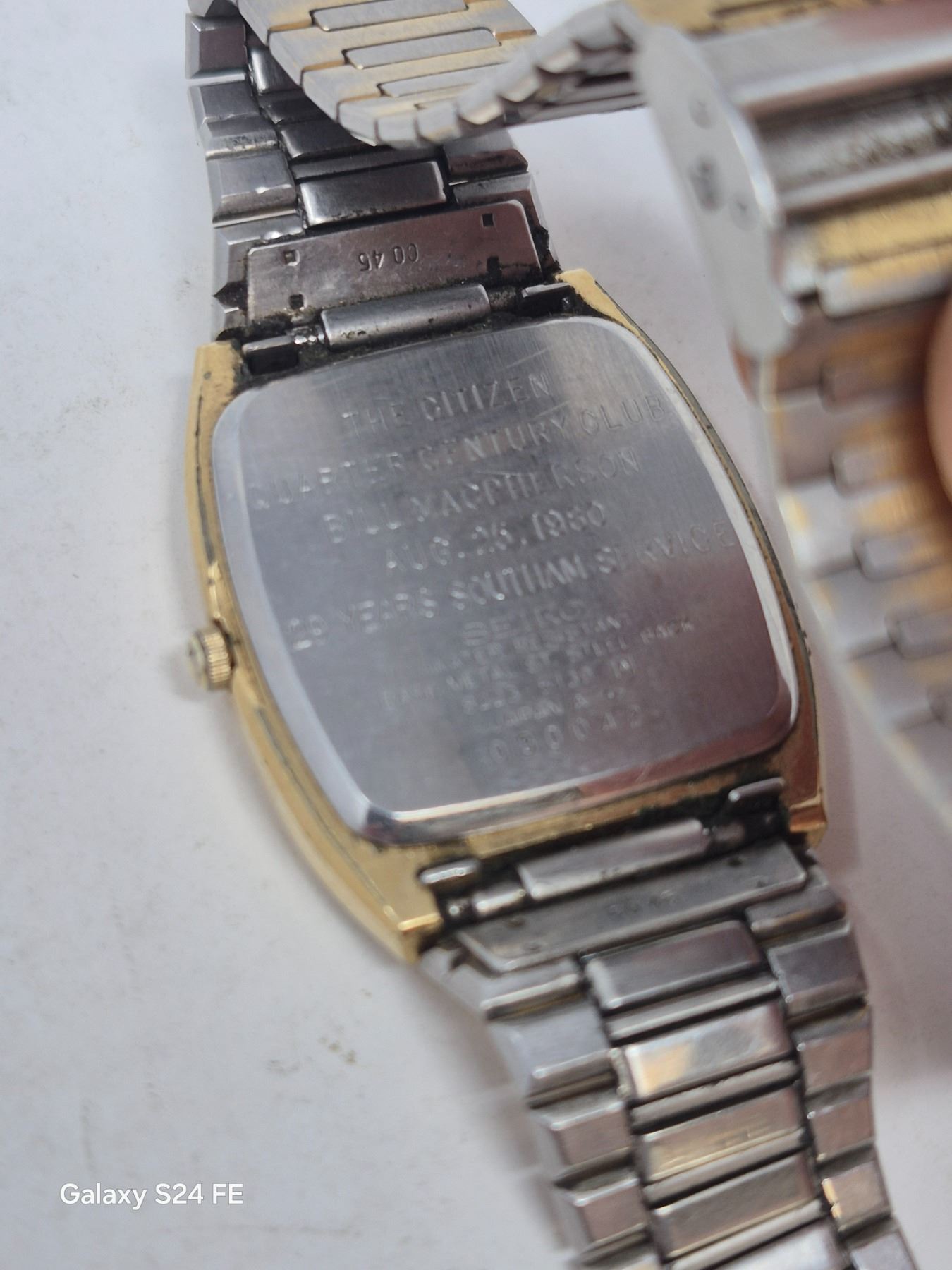 Japanese Seiko Quartz wristwatch with gold-tone face and rectangular case. Day-date window. Back engraving reads: "THE CITIZEN / Quarter Century Club / Bill MacPherson / Aug. 25, 1980 / 25 Years Continuous Service." Model: 8223-5150 R.