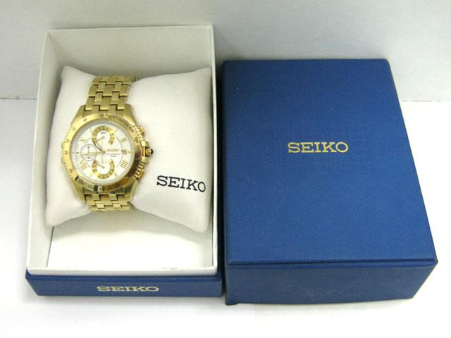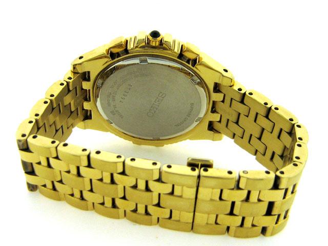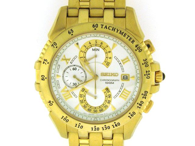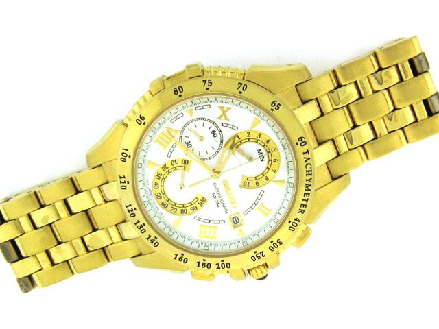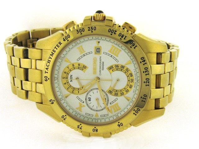 This is a Seiko SPC046 Gold Tone Le Grand Sport Chronograph Watch with the following features: Brushed, polished gold tone stainless steel case (41mm diameter by 10mm thick) and bracelet; White dial with luminous gold-tone hands and hour markers; Date display feature; Chronograph features measures up to 5 hours; cabochon crown; White dial with tachymeter scale; Crystal clear, scratch resistant sapphire crystal; Push-button hidden deployment type clasp; Quartz movement; and Water resistant up to 100m.