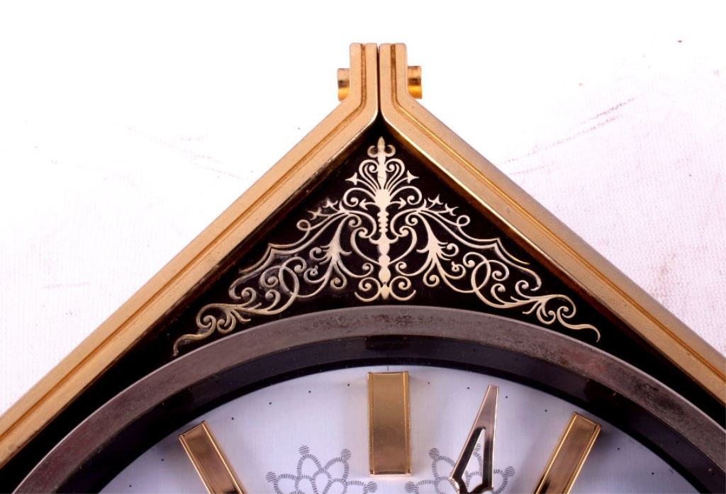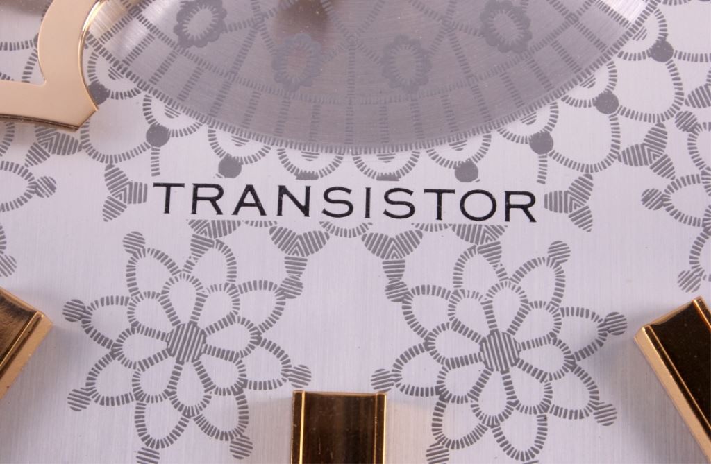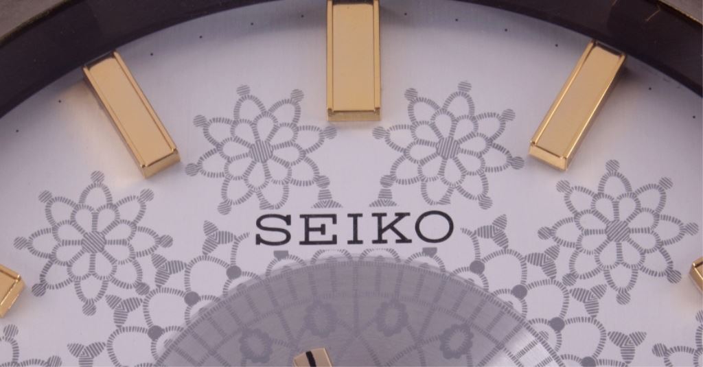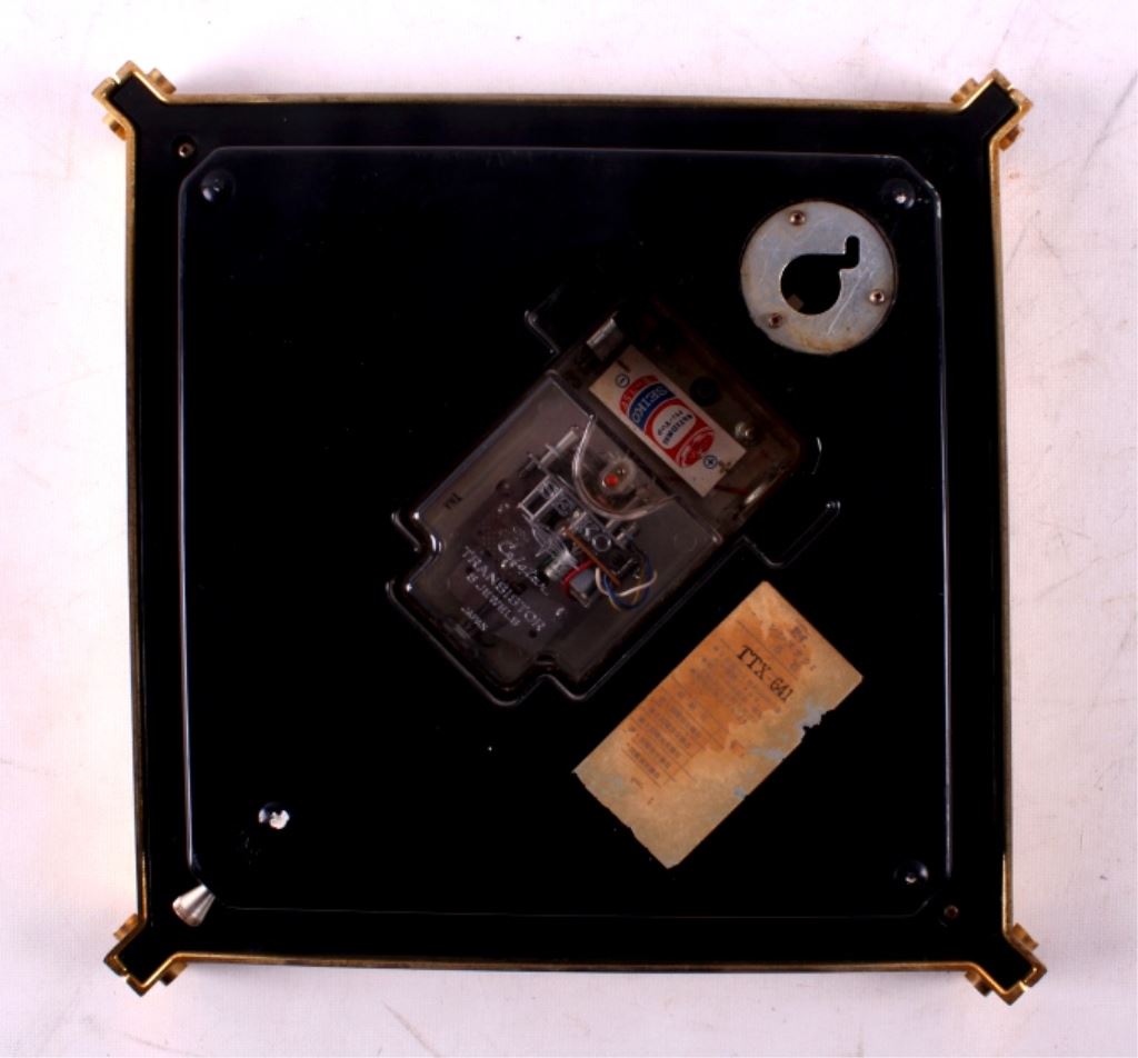 This is a Seiko Transistor wall clock. The clock features a silver toned bezel with a gold toned frame. Inside the frame is a fancy scrollwork that accents the clock beautifully. The Seiko Transistor clock is in good condition. It has been tested and is in good working condition. The clock measures 11.5" x 11.5".