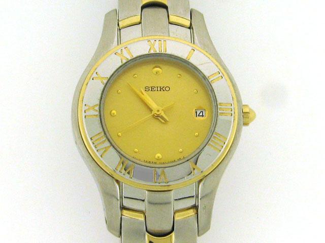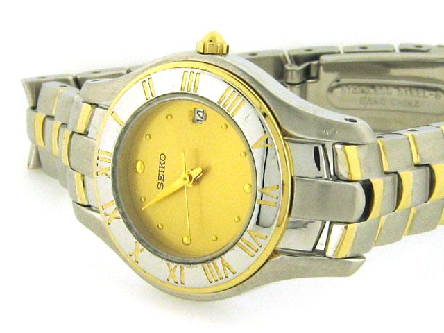 This is a Seiko Two Tone watch with the following features: Gold tone dial; Roman numerals on bezel; Two tone bracelet; water resistant; stainless steel; push/pull crown' date function; japan quartz movement; and water resistant.