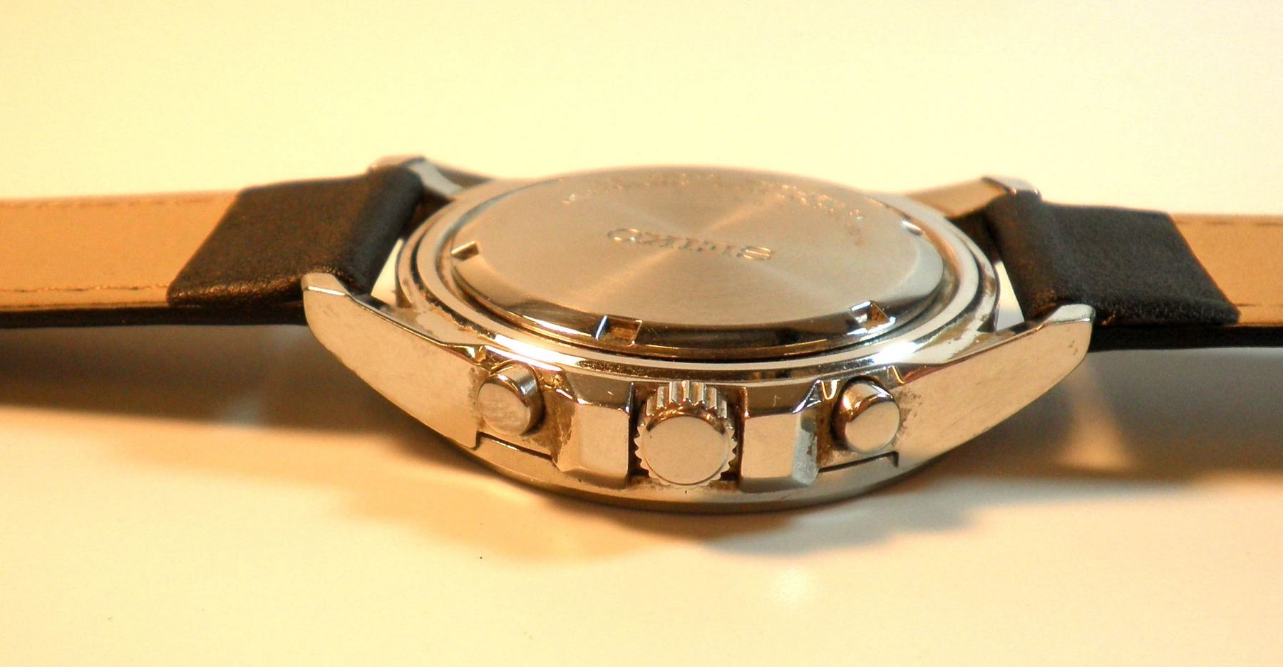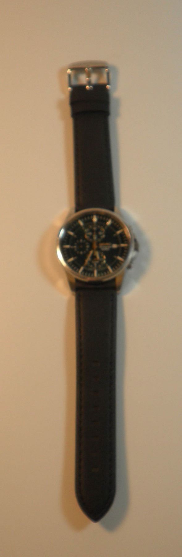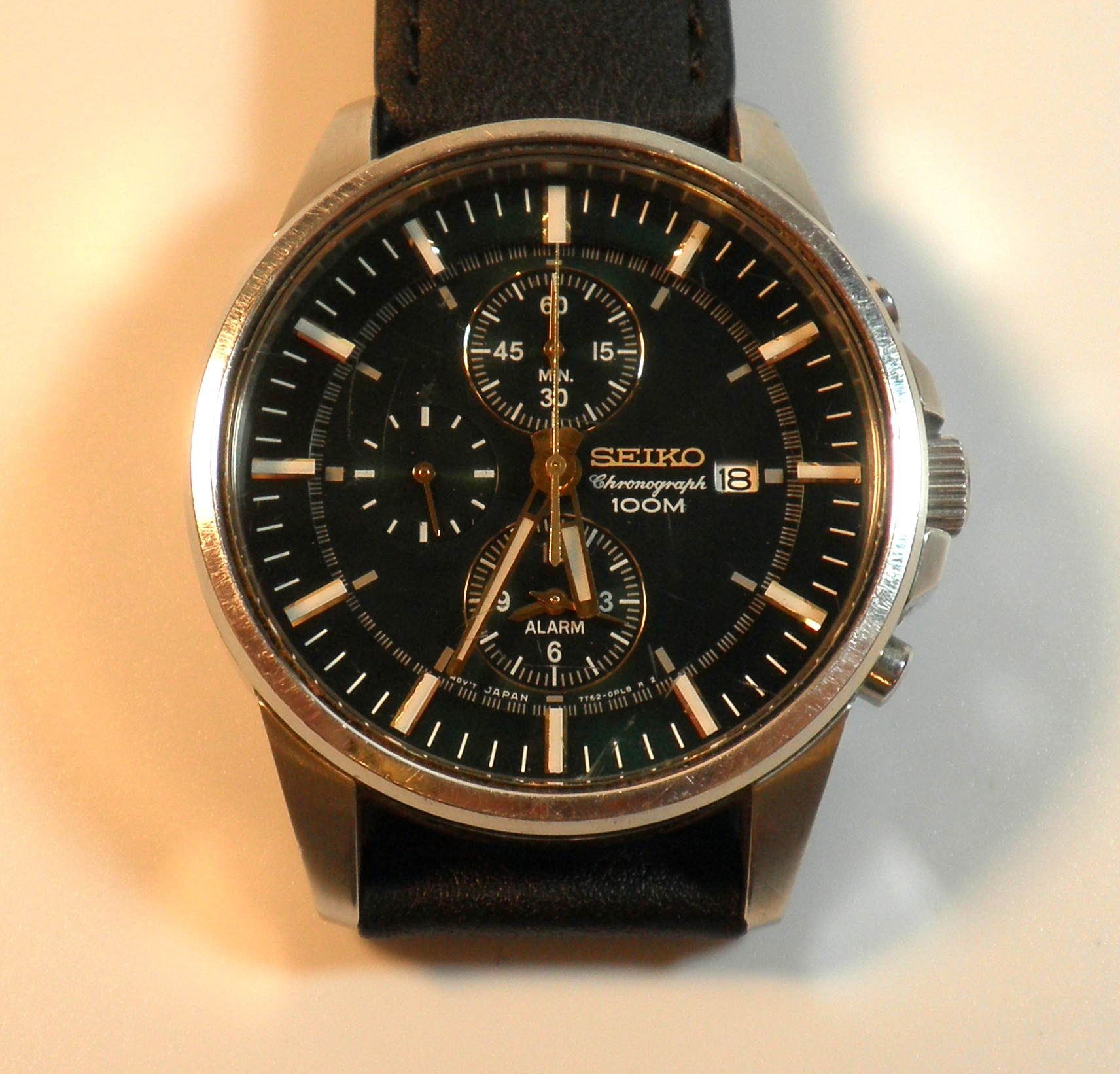 Seiko wristwatch, chronograph model, quartz (battery), dark green board, steel box, box diameter: 40 mm Black leather strap (probably not original) in good condition.