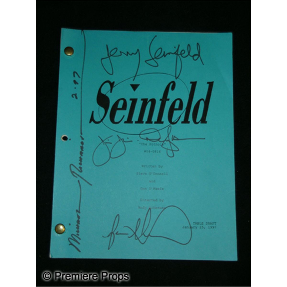 From the one of the most popular series in television history, this is an original production script from “Seinfeld” which has been autographed by the entire cast. The script from “The Pothole” episode originally aired in June of 1990, during the series 8th Season. The signatures appear boldly on the cover – Jerry Seinfeld (Jerry), Jason Alexander (George), Michael Richardson (Kramer) and Julia Louis-Dreyfus (Elaine). This set of autographs is one of the most sought after pieces in collecting today… previous scripts have sold for thousands of dollars in auctions! Obtained directly from a crew member who worked on the series.