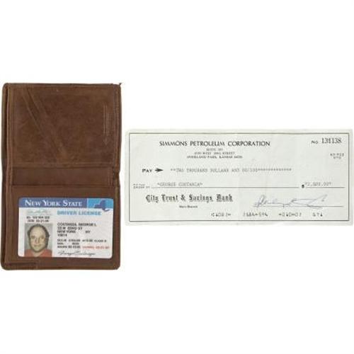 <B>George's</B></I> <B><I>Seinfeld</B></I></B></I> <B>Prop Check and Wallet with License.</B></I> Props for "George Costanza" (Jason Alexander) including a check written from Simmons Petroleum Corporation to George Costanza for $2,000, as well as a brown leather wallet with a clear plastic window exposing George's New York State driver's license, signed "George Costanza." In Fine to Very Fine condition, this fun group of souvenir props was well used; the check has been creased and folded and the wallet has worn edges and tape marks on front and back, and the driver's license is in Excellent condition with a clear image of the dearly loved character.<B>Condition Report:</B> Normal signs of wear as appropriate with age. The check has been folded and creased with dog earred corners. The wallet is worn with tape marks diagonally across front and back, frayed corners and red tape in side marked "George." The driver license is in excellent condition.<BR><BR><b>Shipping:</b> Flat Material, Small (<a target="_blank" href="http://www.heritageauctions.com/common/shipping.php">view shipping information</a>)