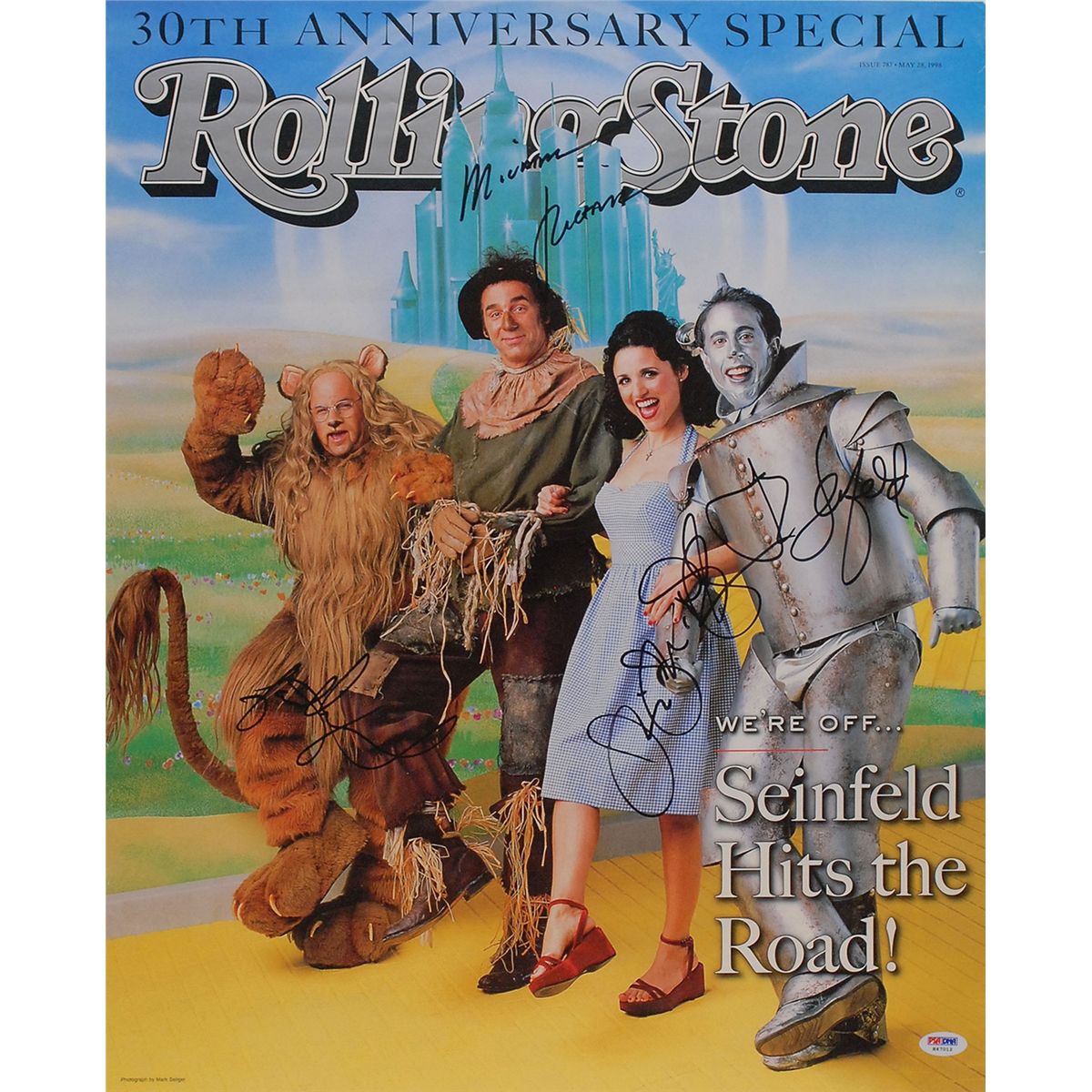 Color 18.25 x 22.5 poster of a Rolling Stones cover featuring the Seinfeld cast as Wizard of Oz characters, signed in black felt tip by Jerry Seinfeld, Jason Alexander, Julia Louis-Dreyfus and Michael Richards. In very good condition, with a few edge dings and horizontal bends and creases.