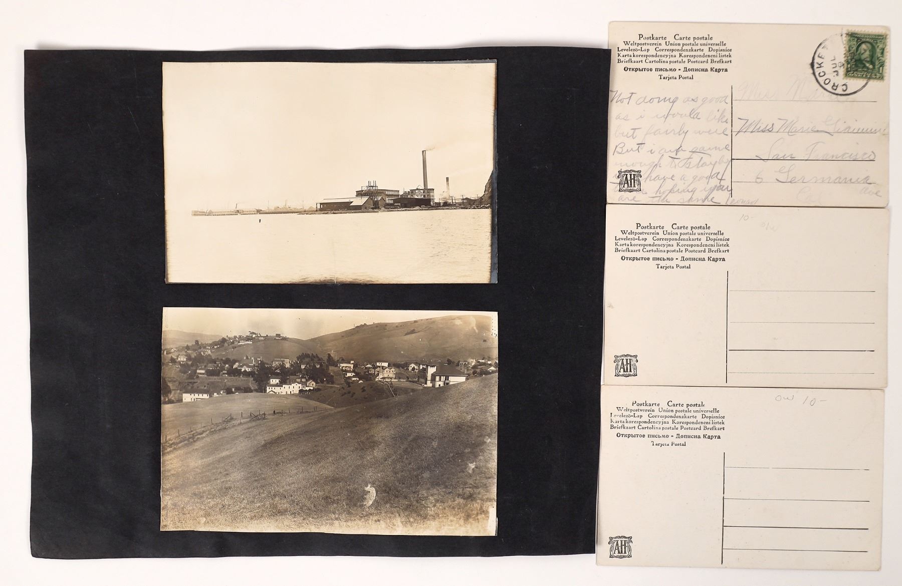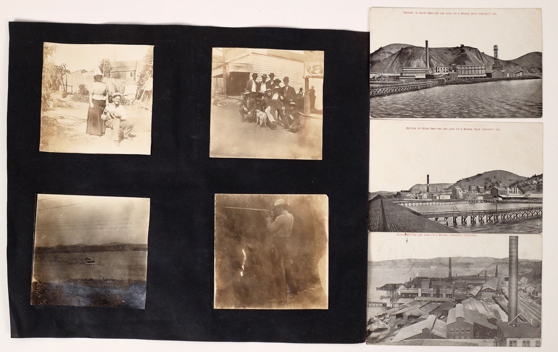 3 rare Selby postcards for the Selby Collector showing the Smelting and Lead Co. operation. 6 small b/w photos of people, a ship and the smelter. Colorado Selby