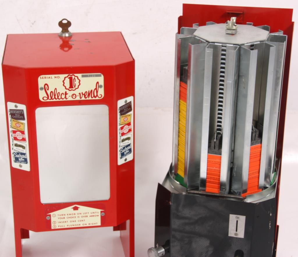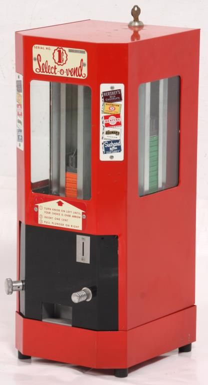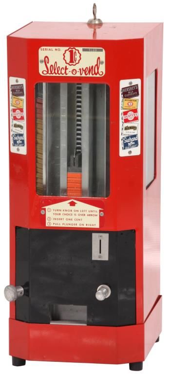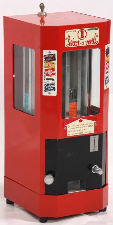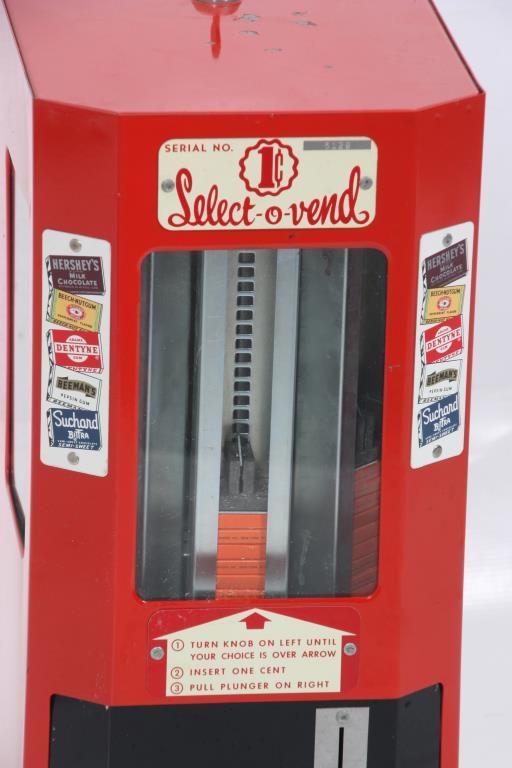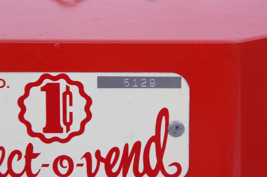Select-O-Vend 1 Cent Vending Machine. Counter top vending machine has a tall square case with chamfered front corners, original red paint with viewing glasses on the front & sides and black panel under the front glass. The interior has an 8 tier revolving rack holding various candy selections with rotating selector knob on the left and plunger knob below the coin slot on the front. Original candy advertising tags on the corners and Select-O-Vend, 1 Cent tag on the crest with serial number 5129. In good working condition, original condition with minor paint flaking on the top, has key. 16.25 in. high x 7.25 in. wide x 8 in. deep.