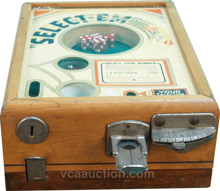Select-em Trade Stimulator - Game is known for its delicate tilt mechanism, number selector, and distinctive graphics. Pick your number and tumble the dice to see how many match; cost 25¢ to play. Good working condition with great tumbling action; key included. Maker is the Exhibit Supply Co, c1935