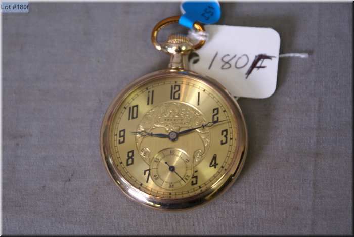 Select size 12, 15 jewel gold filled open face pocket watch, fancy gold dial, working at time of cat