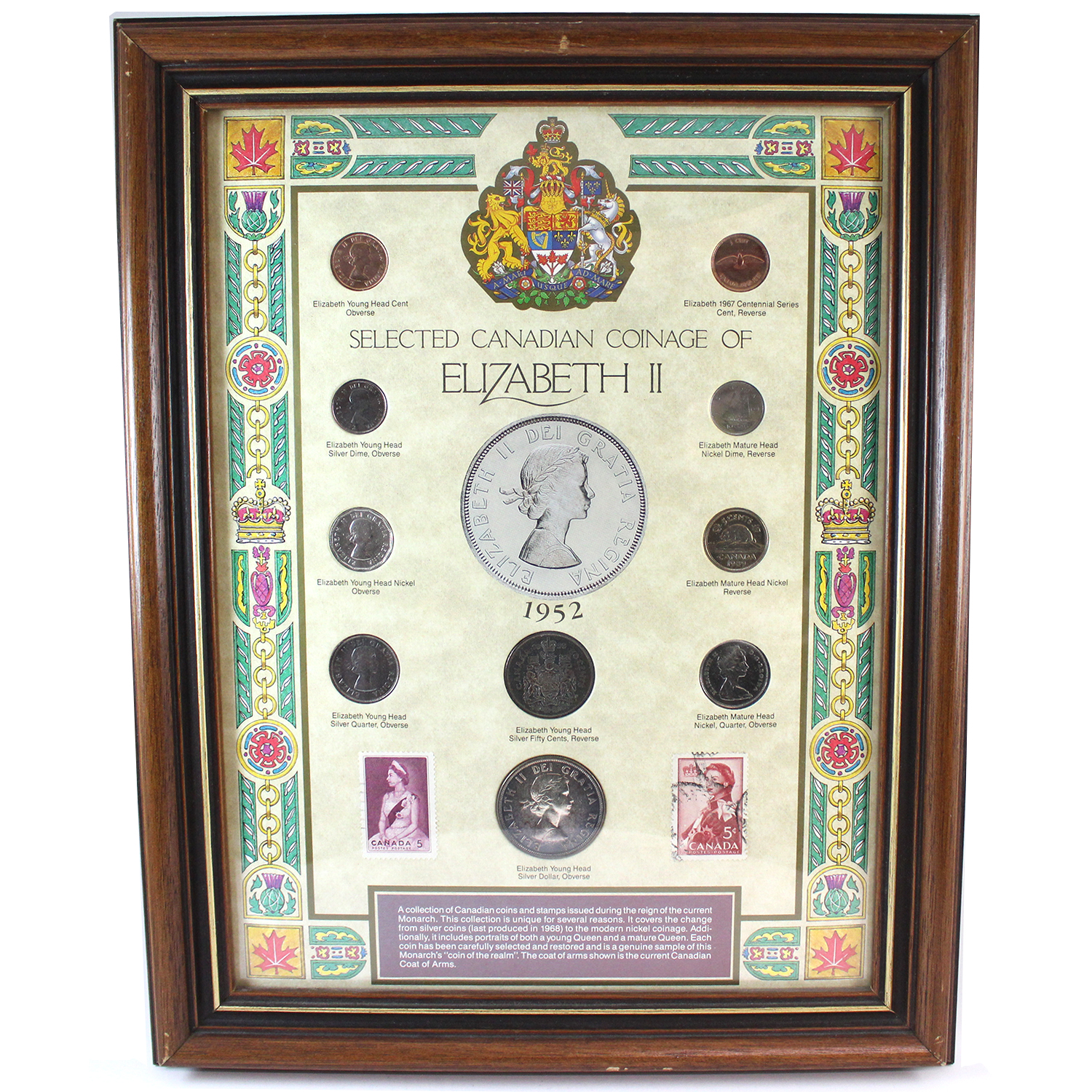 This set features all Coinage denominations with a mix of young and mature Elizabeth portraits. Some coins are toned. Minor scuffs to frame