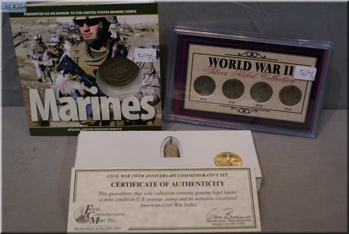 Selection of American collector coins and commemoratives including Civil War 150th Anniversary set, WWII silver nickel Collection and Marines Special tribute medallion