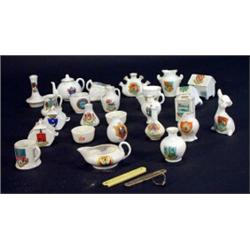 Selection of Arcadian, Goss and other crested china including dog, petrol can, bathing hut, etc
