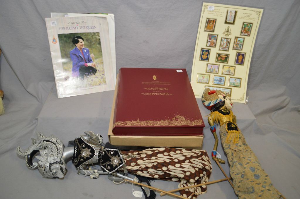 Selection of Asian collectibles including a boxed collector's set including book and medallion of Mahajanaka by His Majesty the King Bhumibol Adulyadej plus a selection of Thailand royalty stamps, collectible magazines and two vintage wooden puppets