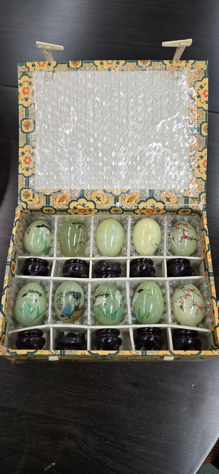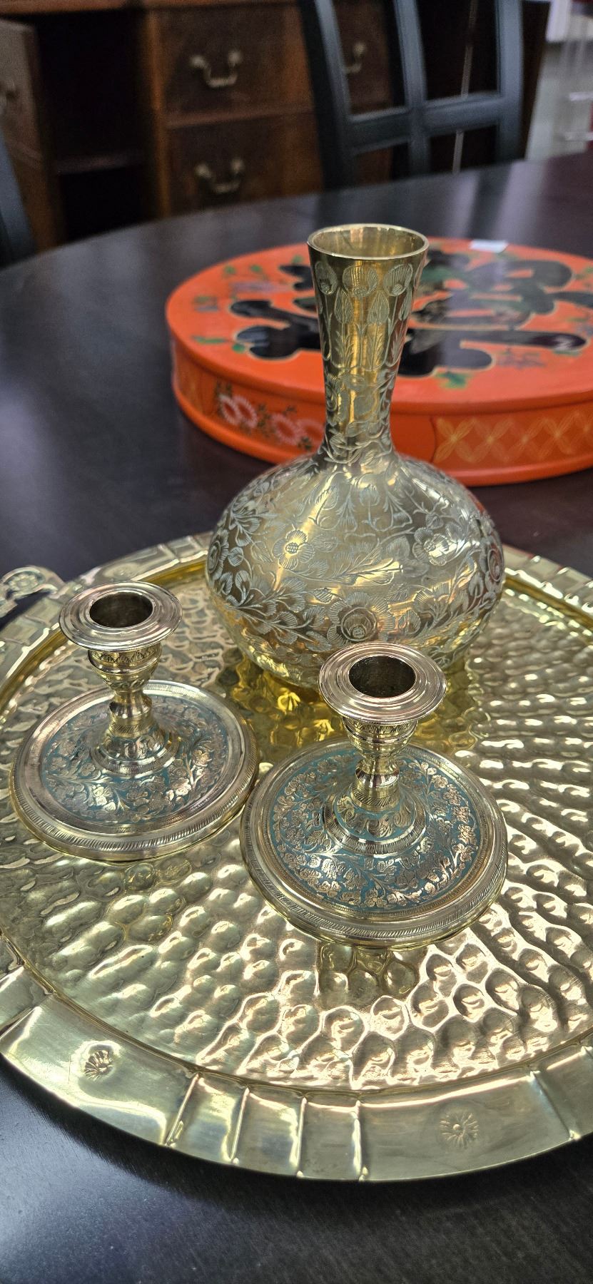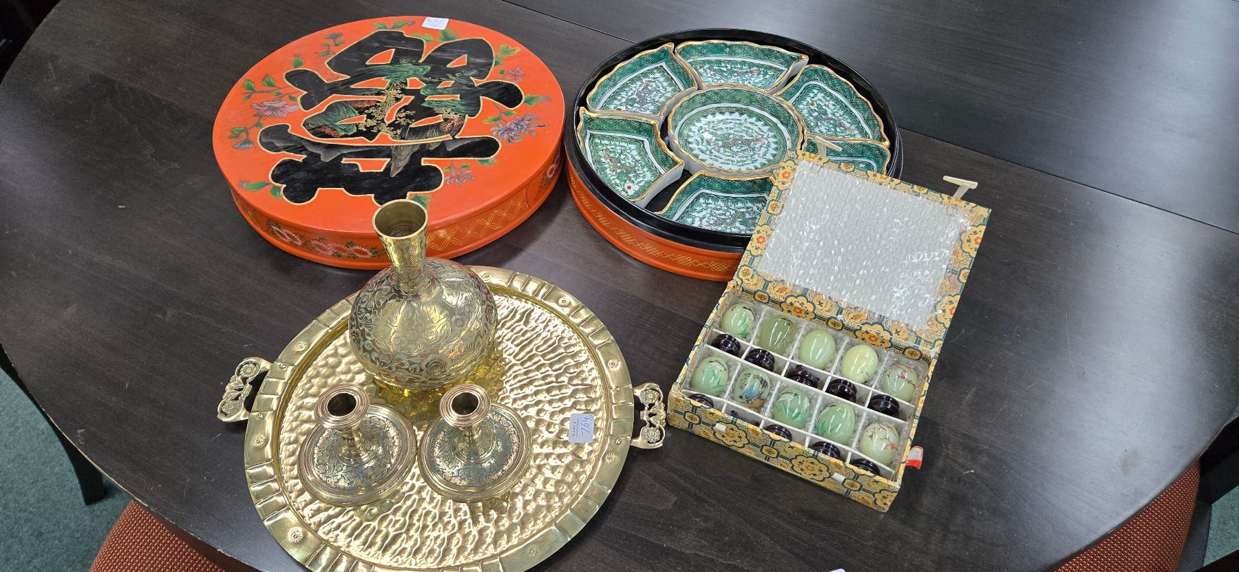 Selection of Asian collectibles including boxed Chinese divided sweetmeat set in fitted lacquered box, brass charger, pair of brass and green enameled candlestick, fitted box of ten decorative miniature eggs on stand, brass charger and a chaised brass vase