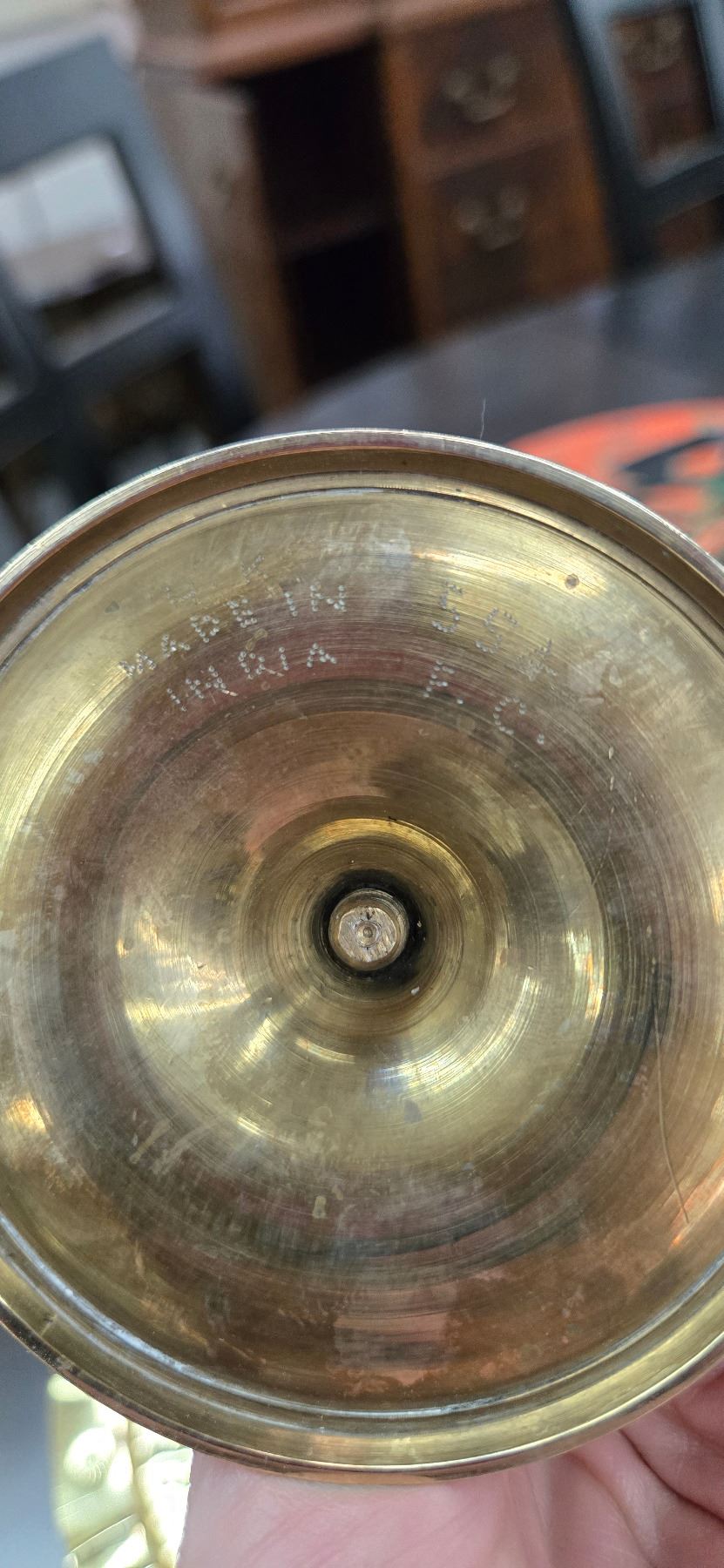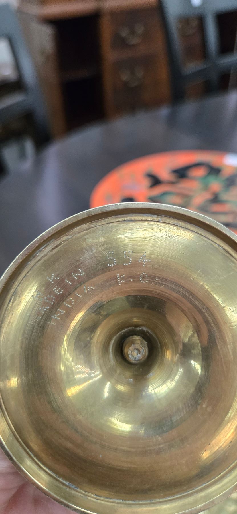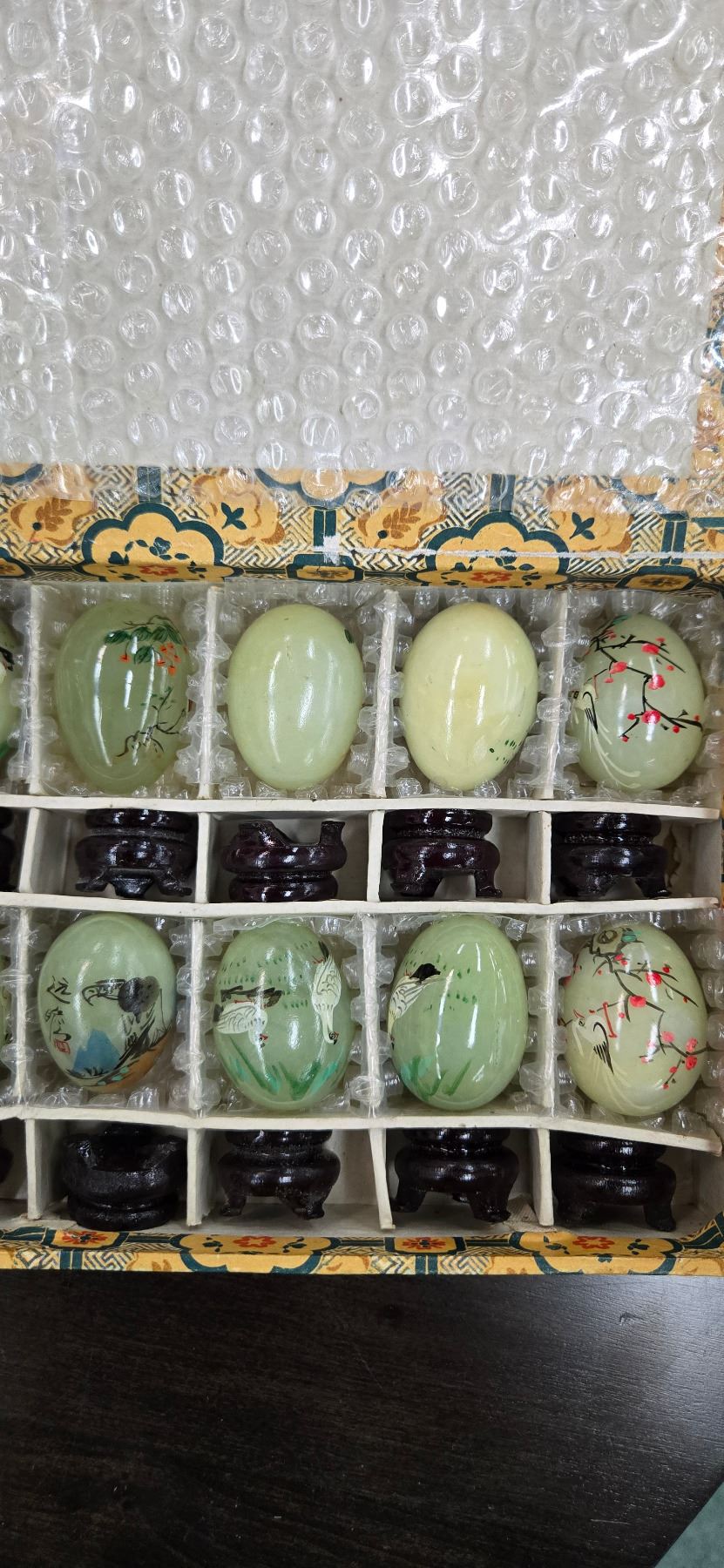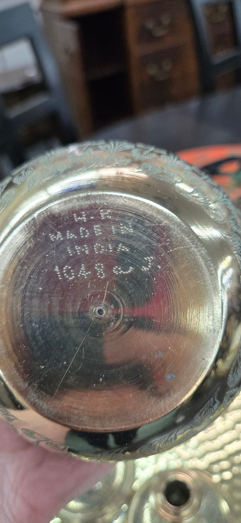 Selection of Asian collectibles including boxed Chinese divided sweetmeat set in fitted lacquered box, brass charger, pair of brass and green enameled candlestick, fitted box of ten decorative miniature eggs on stand, brass charger and a chaised brass vase