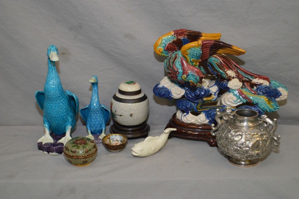 Selection of Asian collectibles including two majolica ducks including 8 1/2" tall with teal and aubergine base, majolica stylized peacock, small silver double handled vessel etc.