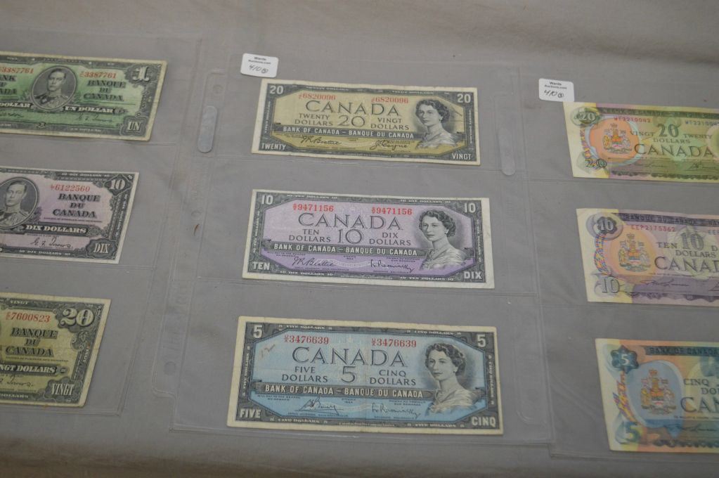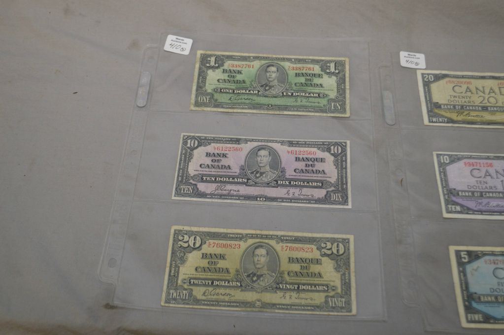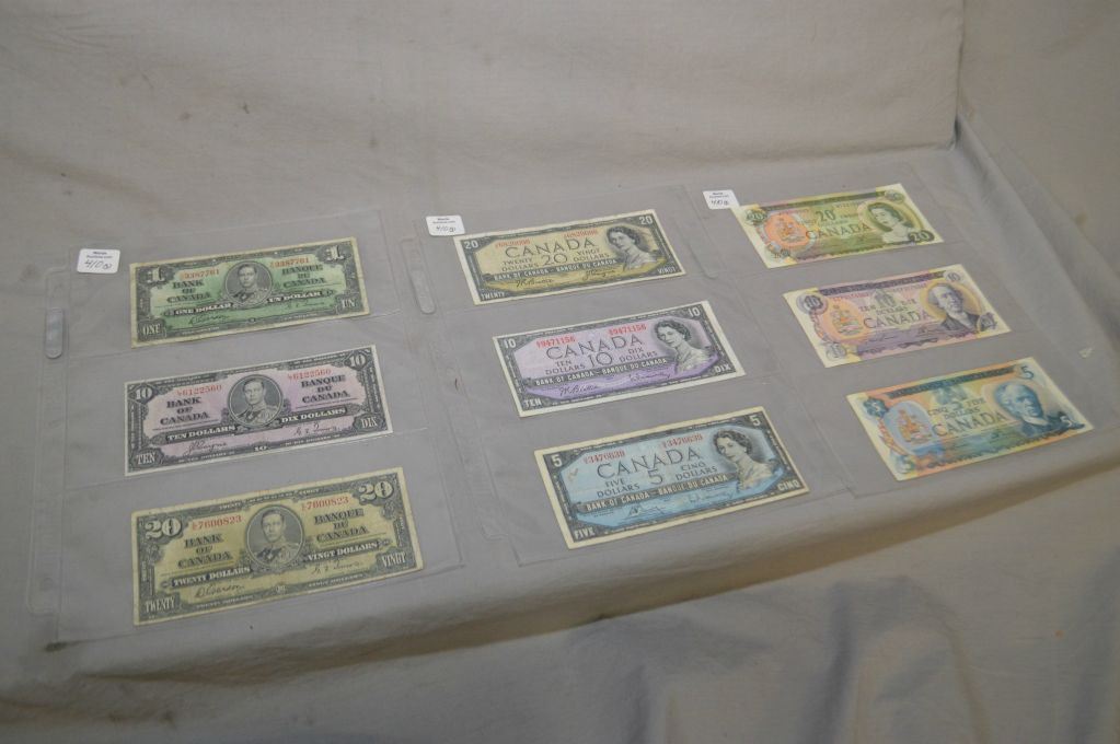 Selection of Canadian bank notes including 1937, one, ten and twenty dollar bill, 1954, five, ten an
