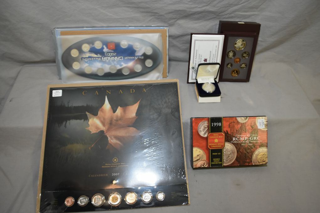 Selection of Canadian coins including a 1995 boxed proof set, 1983 boxed Charles and Diana silver token, 2000 Millennium Canadian boxed collector coin set, 2007 Royal Canadian Mint calendar and uncirculated coin set