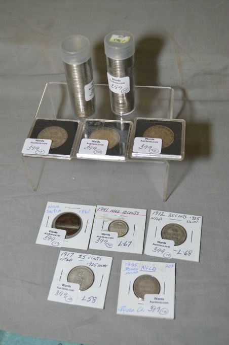 Selection of Canadian coins including two rolls of nickels, three Newfoundland fifty cent pieces, two Newfoundland twenty five cent pieces and Newfoundland twenty cent piece, a Newfoundland ten cent piece and a Nova Scotia penny