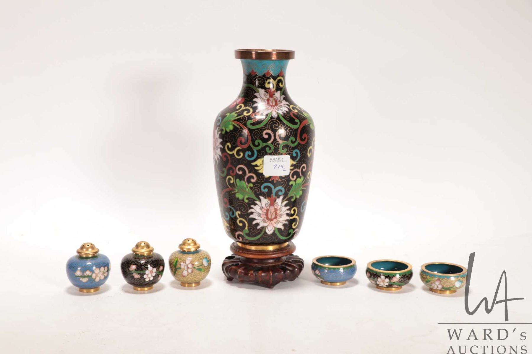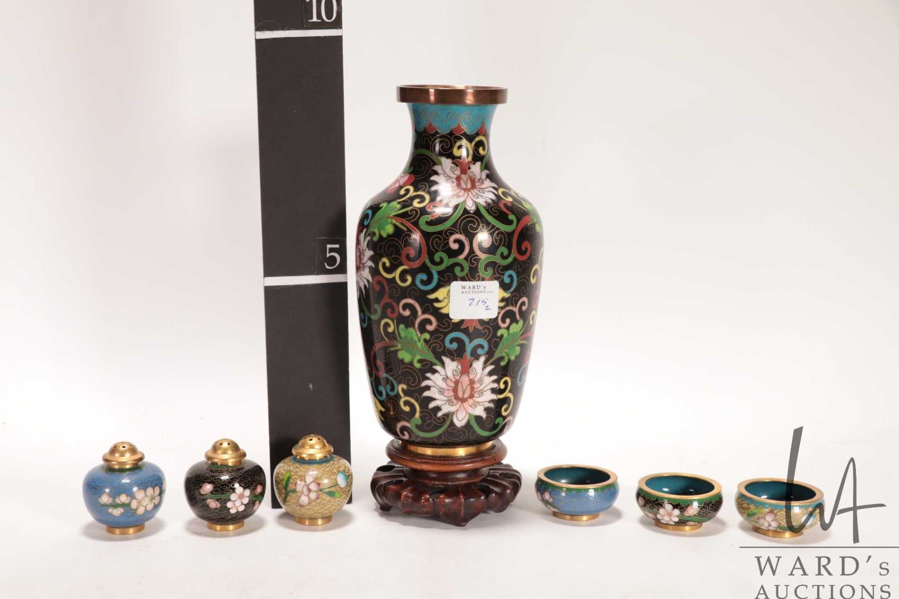 Selection of Chinese cloisonne including three open salts with peppers plus a 9" vase
