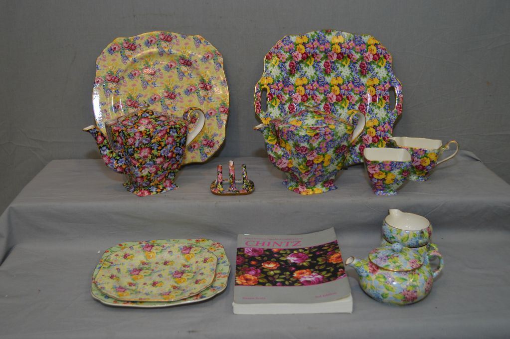 ITEM NOT AVAILABLE FOR SHIPPING. LOCAL BIDDERS ONLY. Selection of Chintz table ware including Royal Winton "Julia" teapot, cream, sugar and toast rack. Royal Winton "Majestic" teapot, Lord Nelson plates, Staffordshire teapot, with stacking cup and a Chintz Collector's reference guide