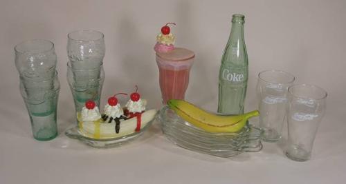 Selection of Coca-Cola glasses, Coca-Cola bottle and Banana Split dishes. Good Cond.