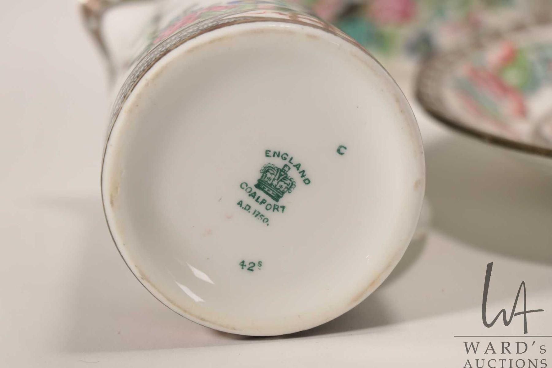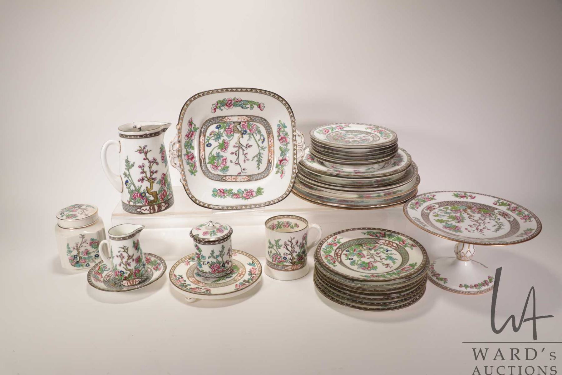 Selection of Coleport India Tree tableware including five 10" plates, three 8 1/2" plates, seven 7 1/2" plates, six 7" plates, pedestal plate, creamer, large hinge lidded creamer, etc. Plus a Sadler tea caddy. Note: Not available for shipping. Local pickup only