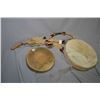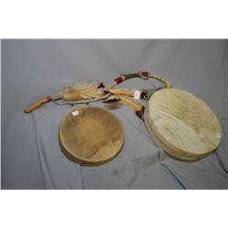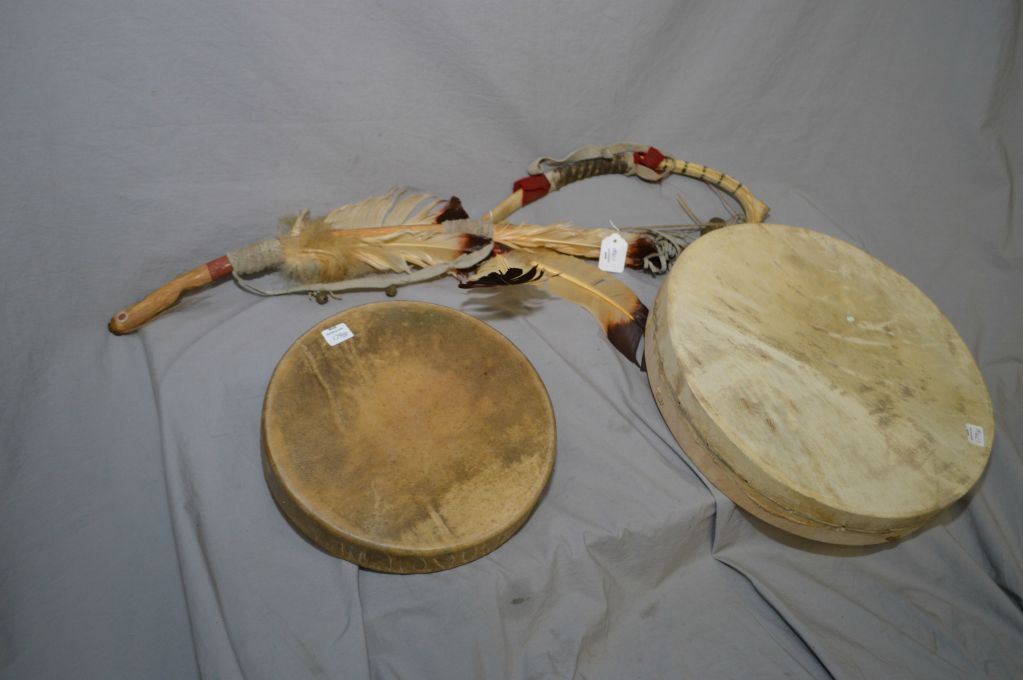 Selection of First Nations ceremonial pieces including one bone and one wooden rattles, and two drums