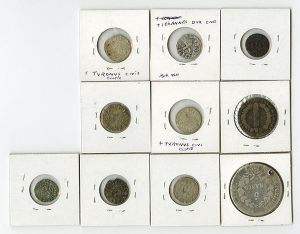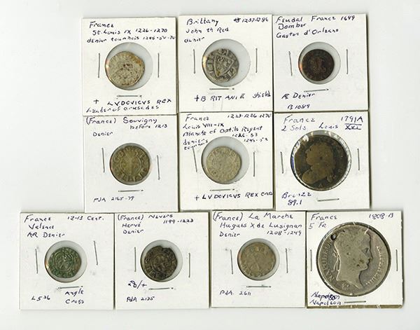 France. Includes Deniers of Valence; Herve; Souvigny; Hugues X de Lusignan; Louis VIII-IX; Louis IX; John the Red; Two Bronzes and a holed 5 Franc of Napoleon 1808 B. The hammered are quite nice VF or so, the others Very Good. 10 pieces.