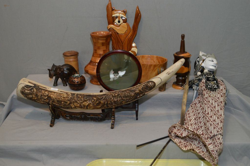 Selection of Indonesian collectibles including treenware animals, figures and vase, puppet and large resin tusk on wooden base