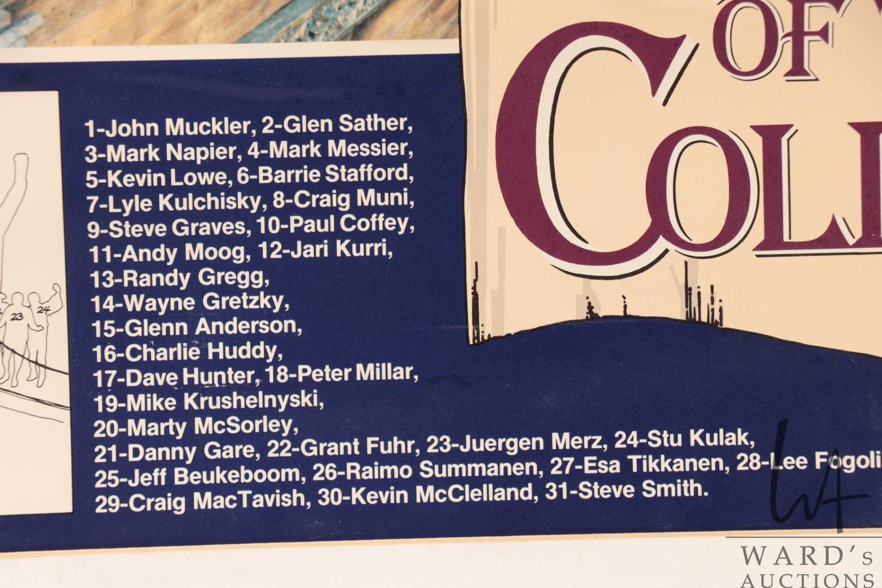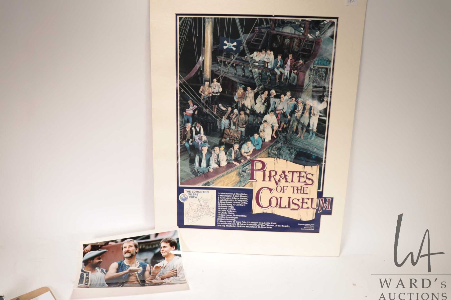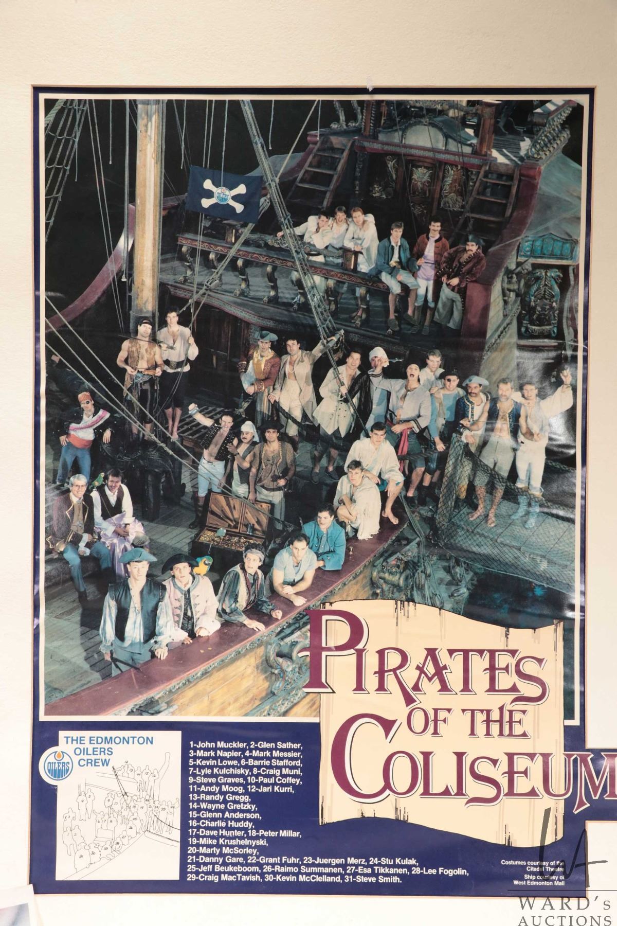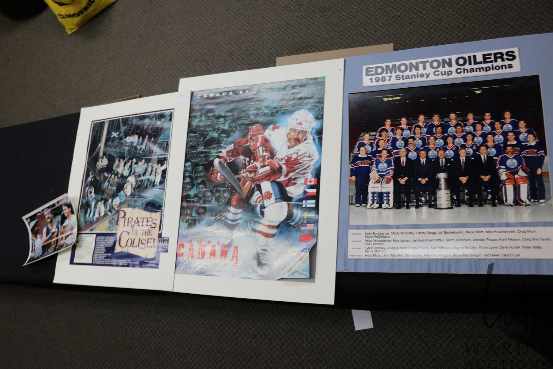 Selection of Oilers memorabilia from the 1986-87 heyday including a "Pirates of the Coliseum" original poster, plus glossy promo from the same photo shoot and a "Edmonton Oilers 1987 Stanley Cup Champions"poster plus a hand signed "Canada '87" Canada Cup poster with signatures including Wayne Gretzky, Glen Anderson, Grant Fuhr etc. All from the personal selection of Oiler's masseuse Juergen Merz, circa 1980's. Note: Artwork is often too large to ship economically and cannot be insured. Local pickup only