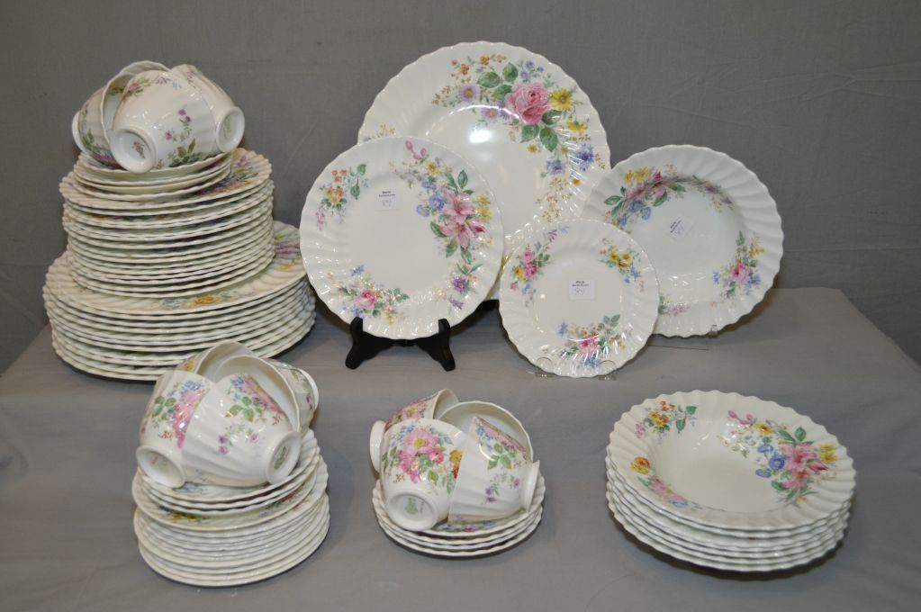 THIS ITEM IS NOT AVAILABLE FOR SHIPMENT. LOCAL BIDDERS ONLY. Selection of Royal Doulton "Acadia" dinnerware including settings for eight of dinner plates, side plates, bread and butter plates plus cups and saucers and four extra dinner plates, eight extra side plates and four extra tea cups and saucers