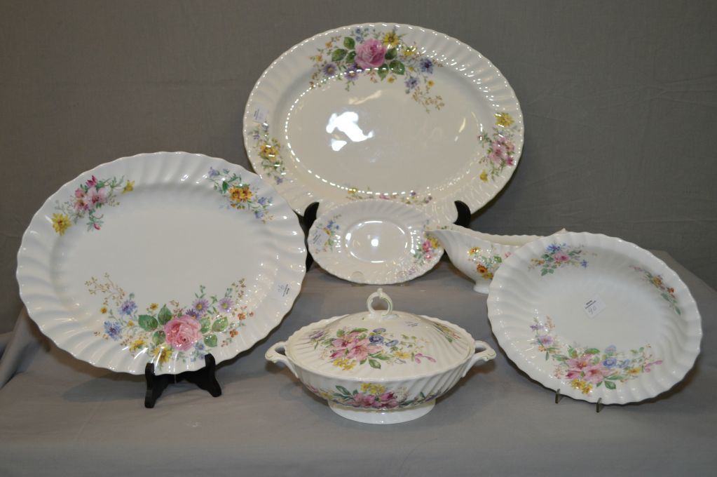 Selection of Royal Doulton "Acadia" serving pieces to match lot 89 including large platter, medium platter, covered vegetable dish, gravy boat and drip tray