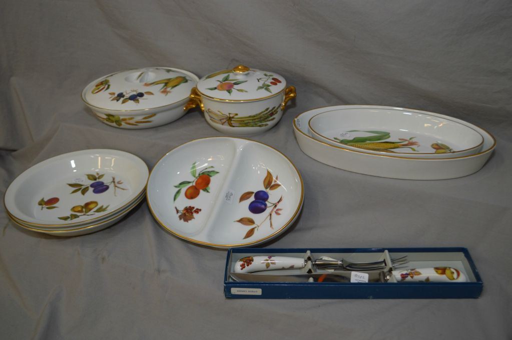 Selection of Royal Worcester "Evesham" including two round covered casserole dishes, two round pie plates, oval divided dish, two graduated oval side dishes, and boxed carving set