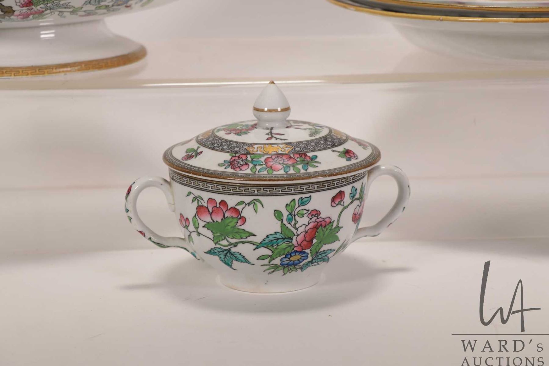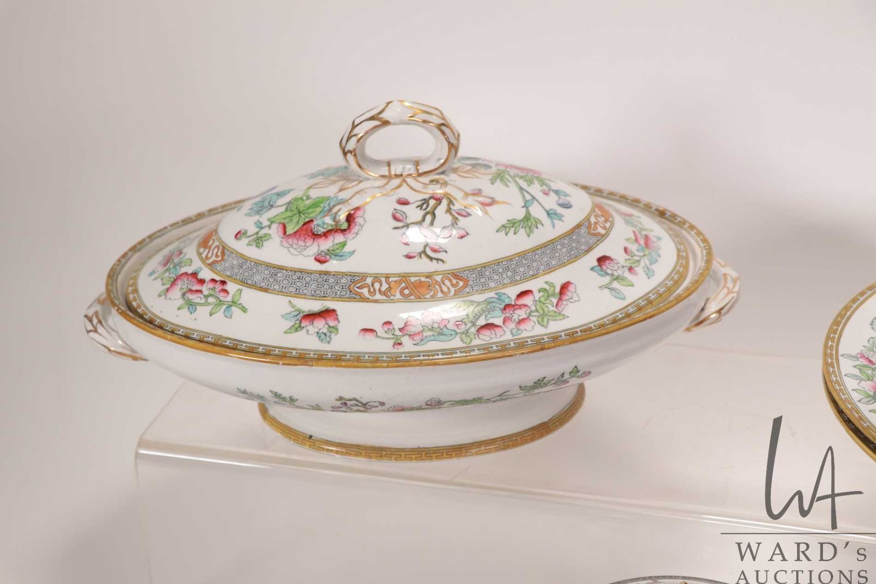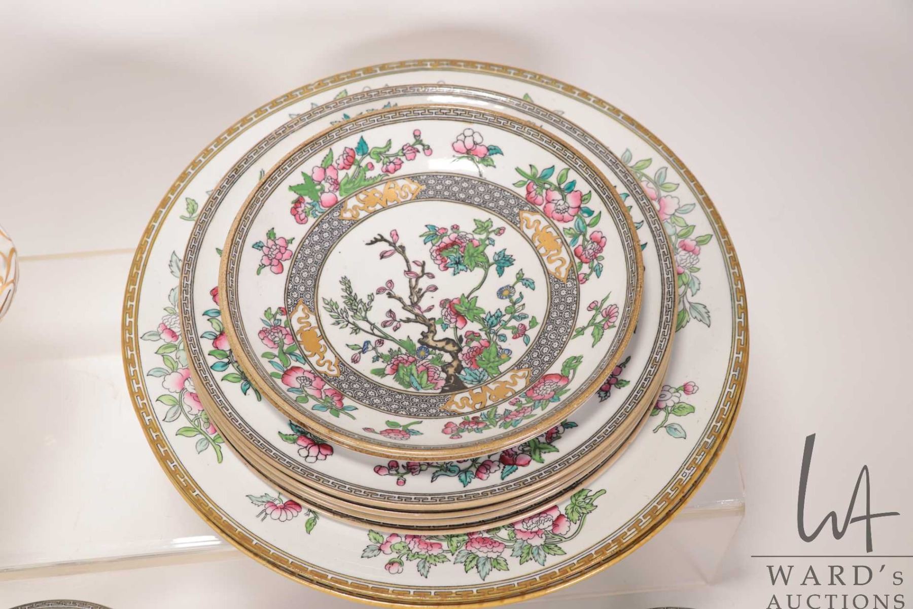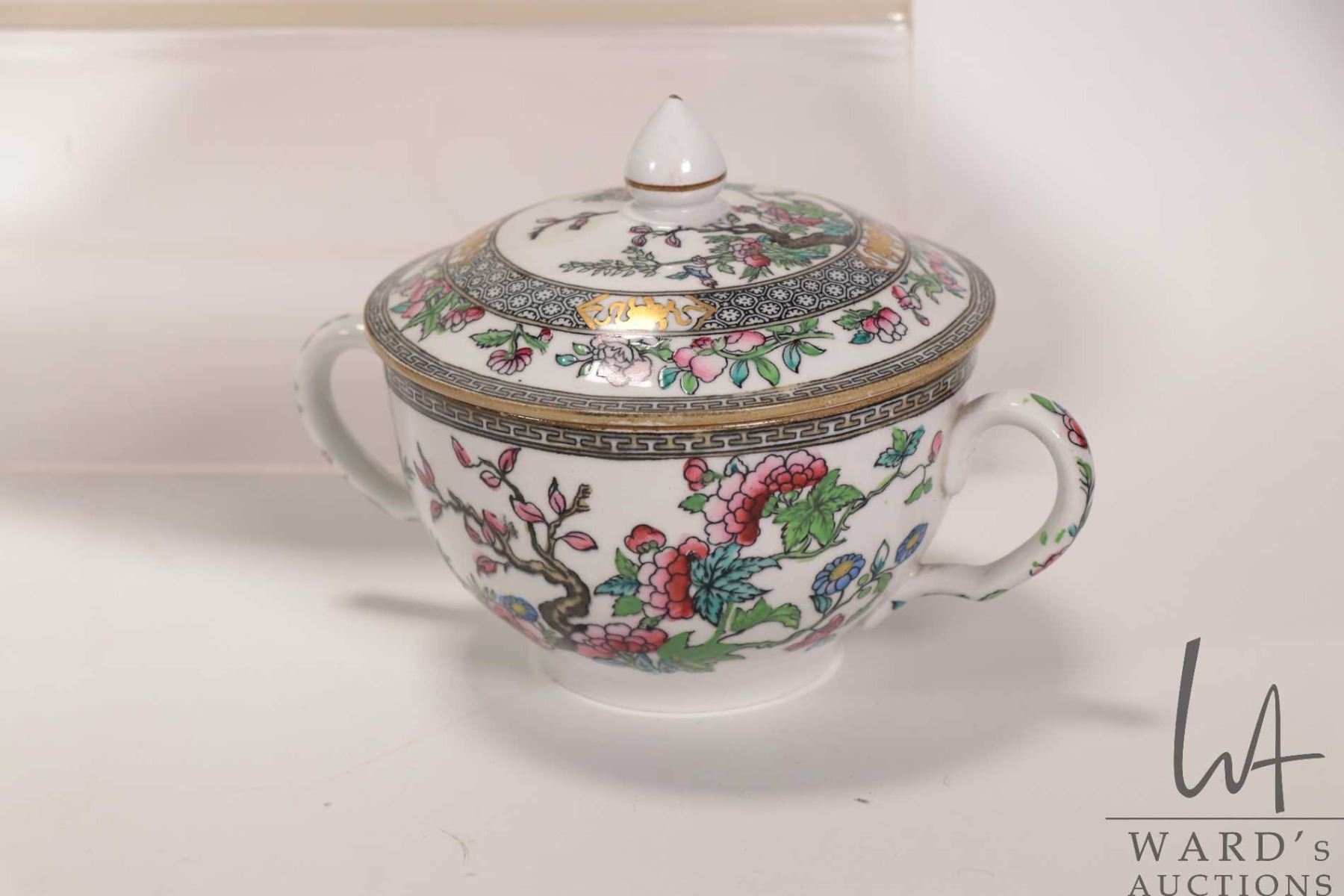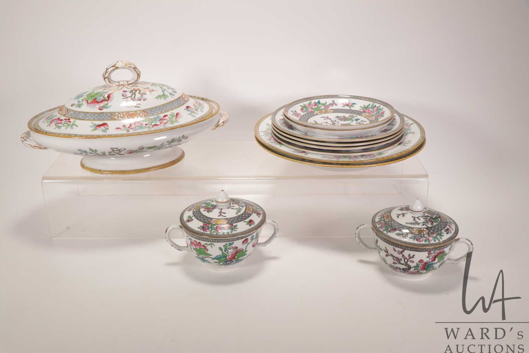 Selection of Wedgwood and Minton Indian Tree tableware including 12" lidded server, two lidded soup bowls w/ saucers and six assorted plates. Note: Not available for shipping. Local pickup only