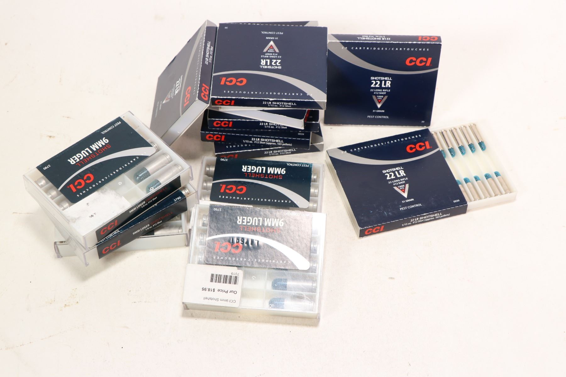 Selection of ammunition including five 10 round packages of CCI 9mm luger shot shell and nine 20 count packages of CCI .22 Long shot shell 31 grain.