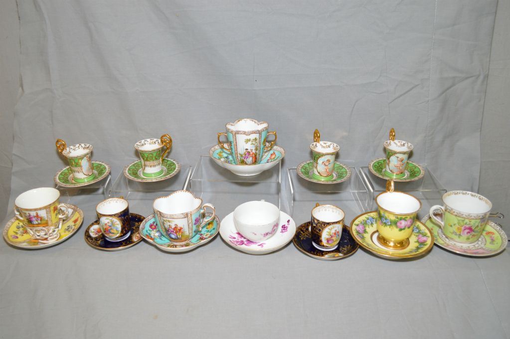 ITEMS NOT AVAILABLE FOR SHIPPING. LOCAL BIDDERS ONLY. Selection of antique demis and/or tea cups and saucers including Vienna, Miessen, unmarked etc. note one demi has been glued and one saucer has been glued