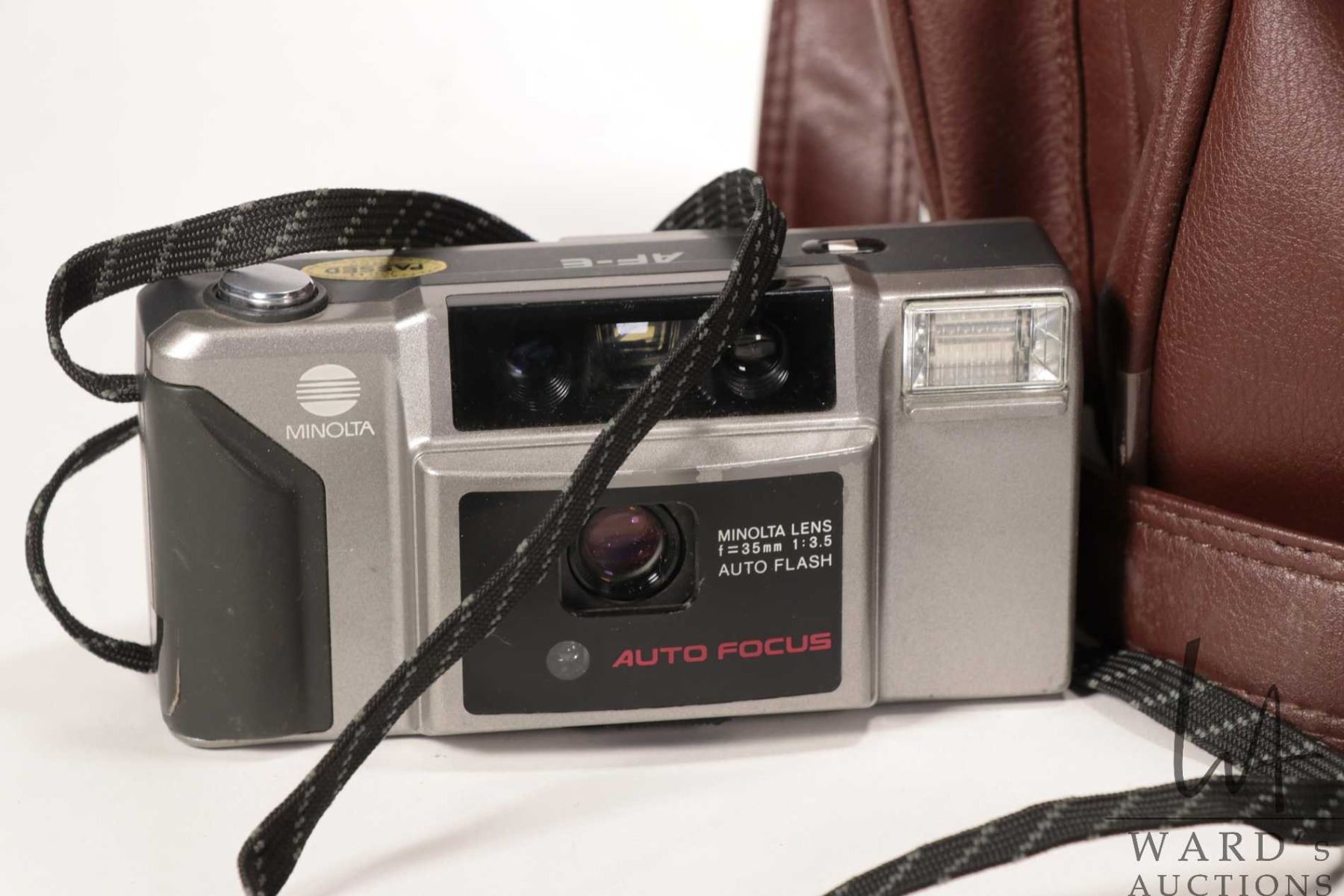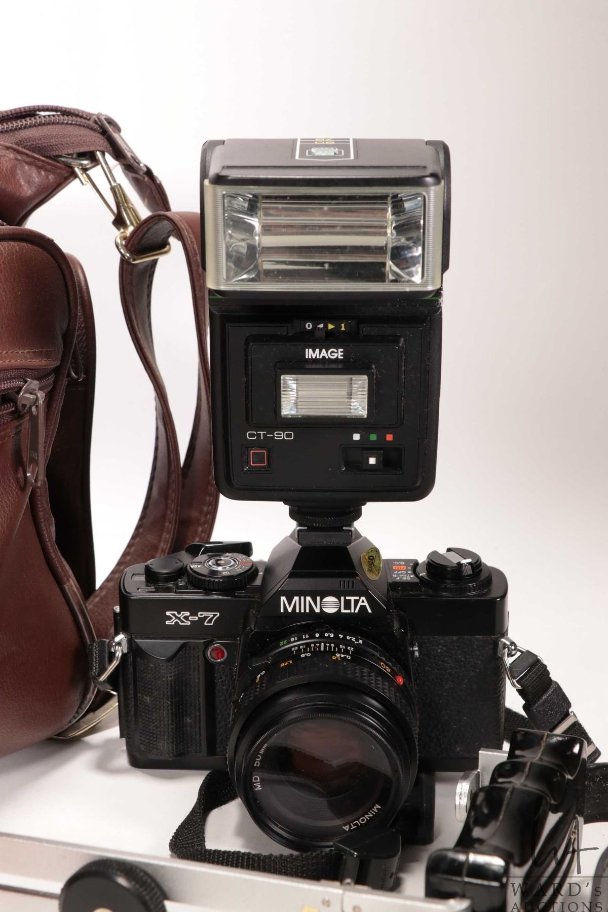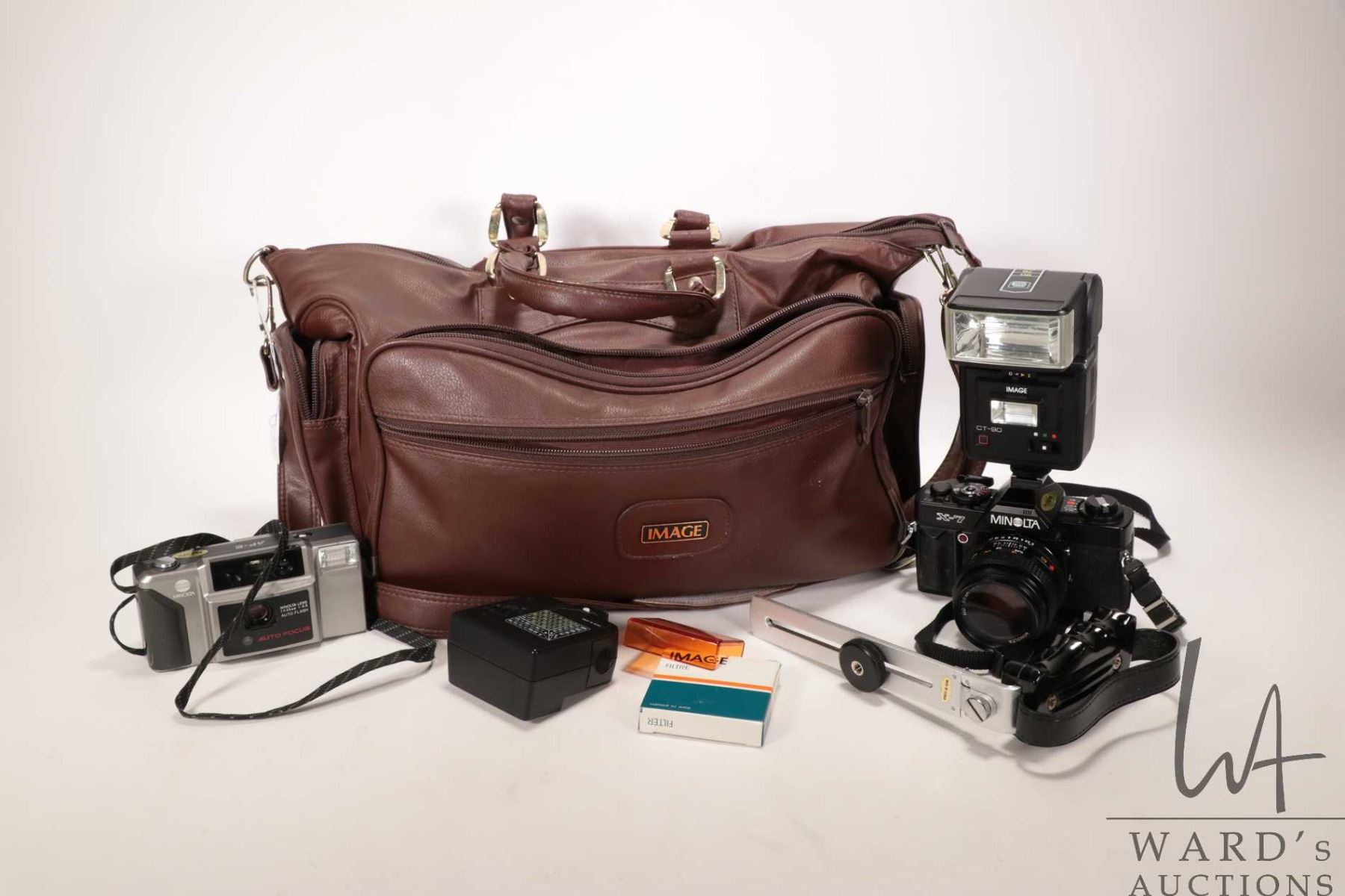 Selection of camera gear including Minolta X-7 camera, Image CT-90 flash, Minolta AF-3 camera plus b
