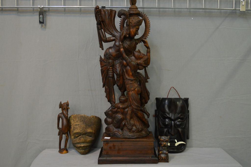 Selection of carved Indonesian treenware including 30" sculpture, two masks etc.
