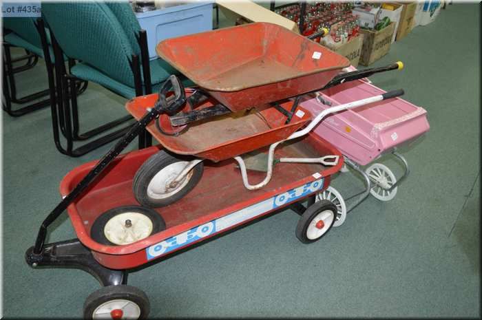 Selection of child's toys including pull way, two wheel barrows and a pram