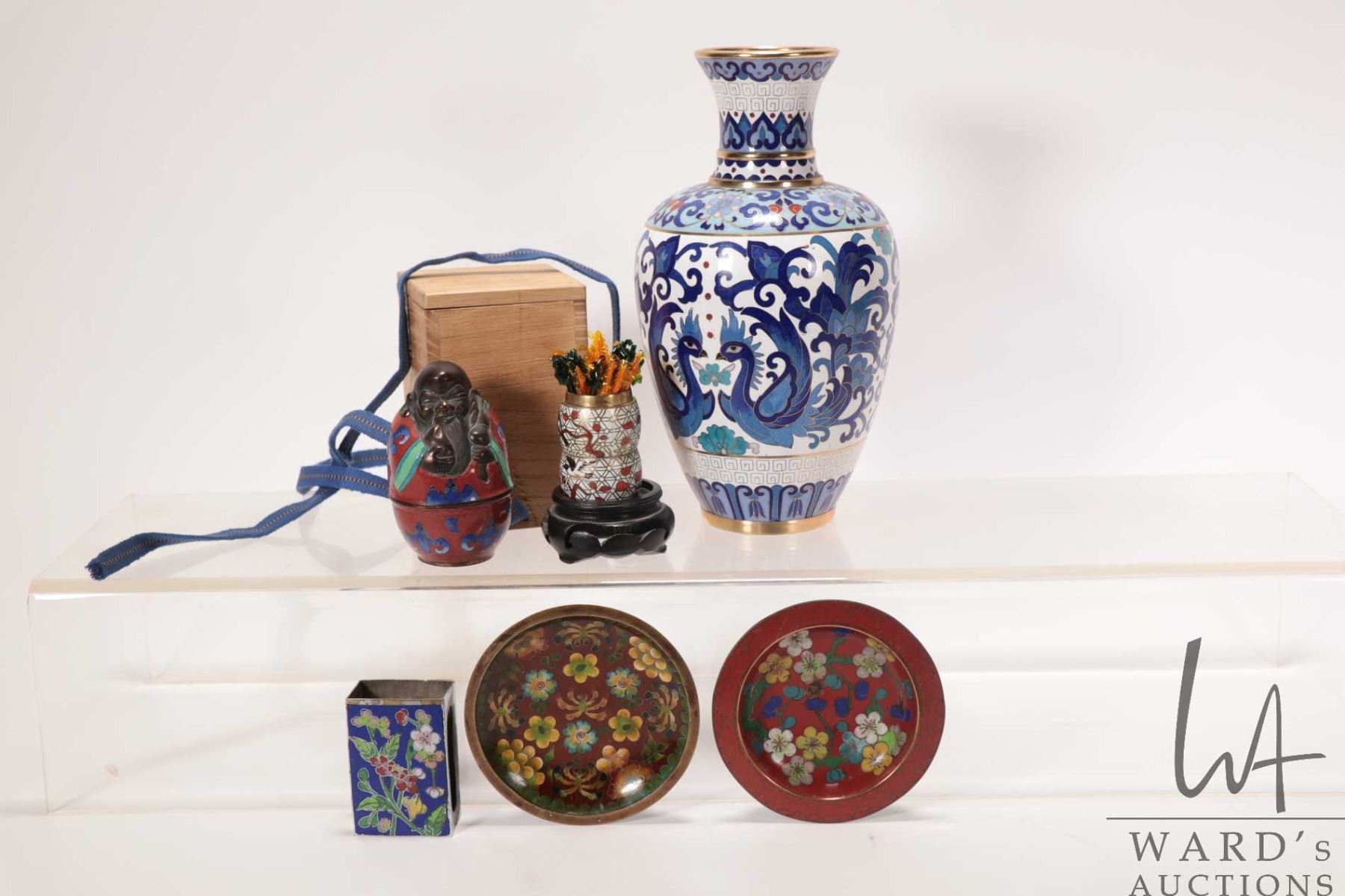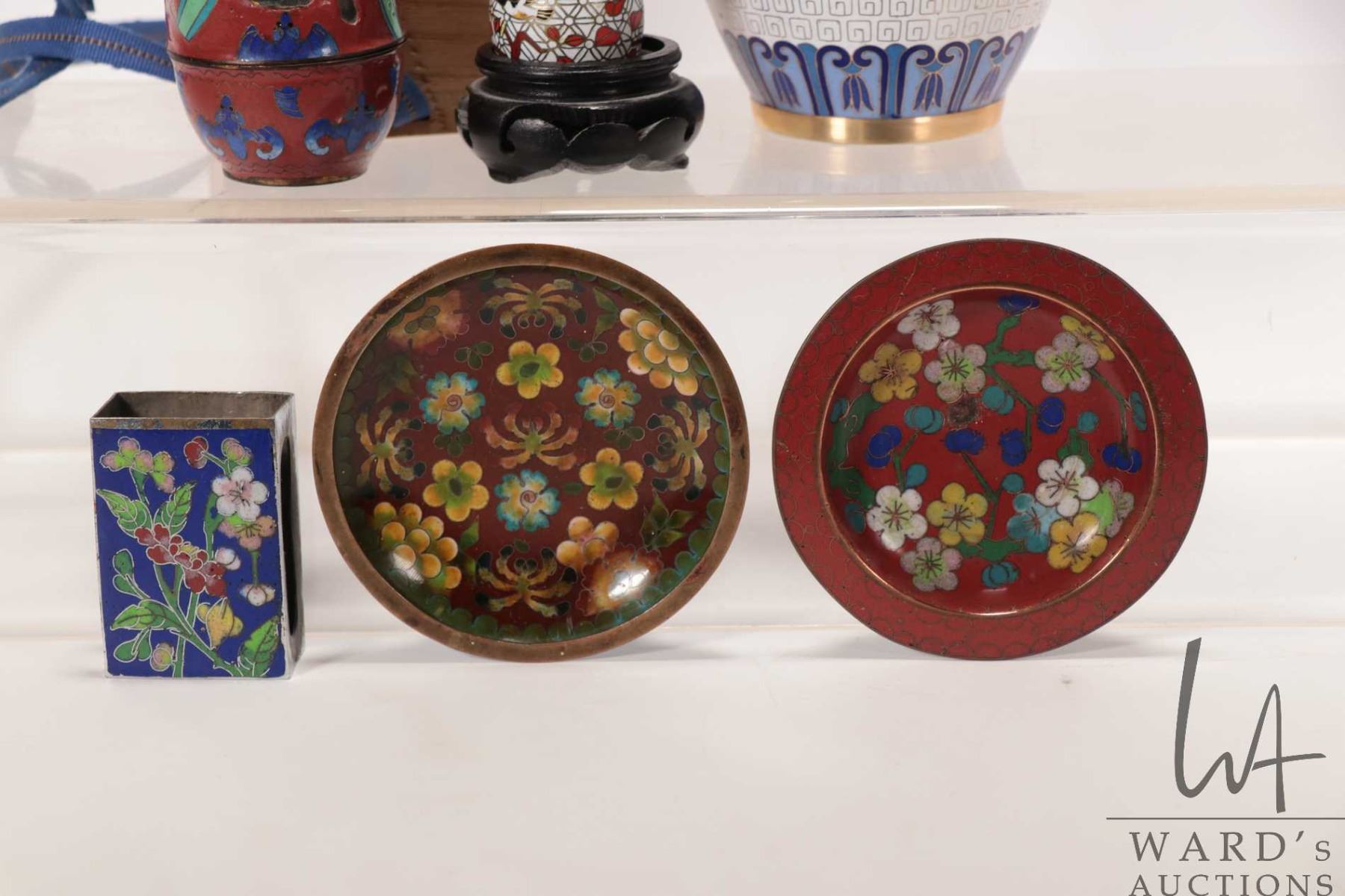 Selection of cloisonne including 8 1/2" high vase, match stick holder, small plates, etc
