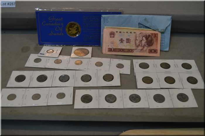 Selection of collectible currency and coins including foreign bills, Canadian Oil Sands token, Ameri