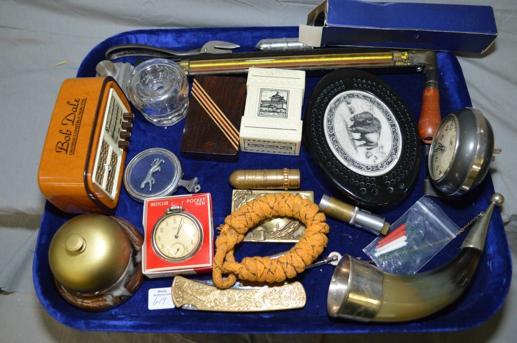 Selection of collectibles including Delmonico can opener, a Baby Ben clock, Westclox pocket Ben, interesting counter bell, folding knife, bullet lighter, Jaguar hood ornament etc.