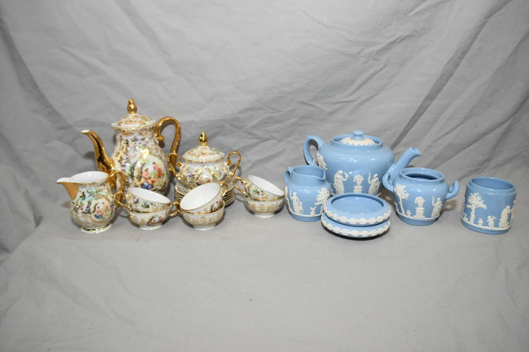 THIS ITEM NOT AVAILABLE FOR SHIPMENT. LOCAL BIDDERS ONLY. Selection of collectibles including Queensware teapot, cream and sugar, two small pin trays etc. and a Bavarian "Love story" tea service including six cups and saucers