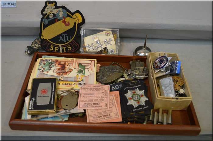 Selection of collectibles including RCAF collectible pins, badges and military related paperwork, embroidered patches, Edmonton Fire Department badges and pins, vintage stamps, zippo lighters etc.