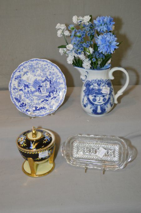 Selection of collectibles including a Noritake spooner, blue and white plate and jug, and a pressed