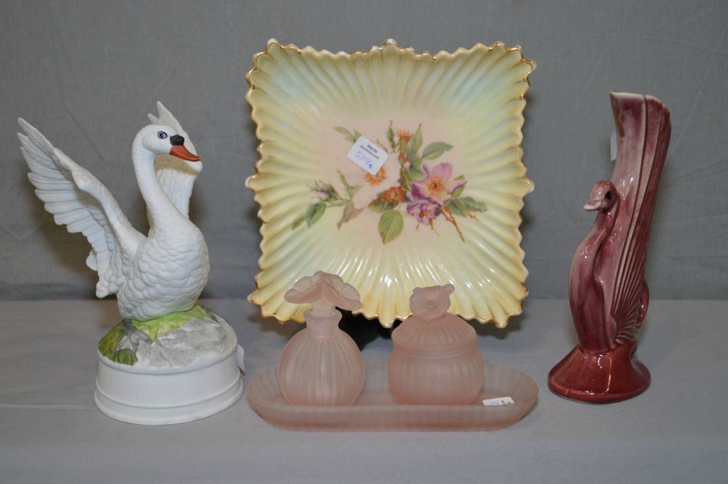 Selection of collectibles including hand painted plate, dresser set, bird and vase